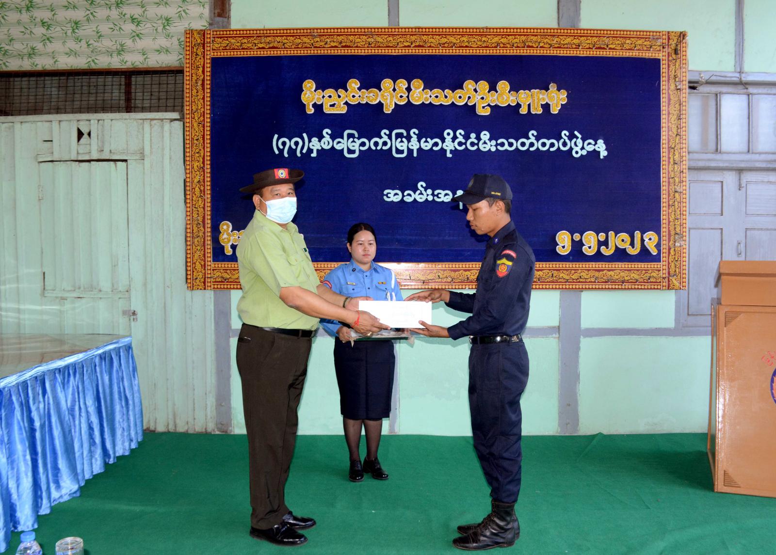 ဆက်လက်၍ (၇၇)နှစ်မြောက် မြန်မာနိုင်ငံမီးသတ်တပ်ဖွဲ့နေ့ အထိမ်းအမှတ် ပြည်နယ်အဆင့် မီးသတ်ကျင့်ဝတ်ဖြေဆိုပွဲတွင် အကြပ်အဆင့်နှင့် တပ်သားအဆင့်၌ ပထမဆုရရှိခဲ့ကြသူများအား ခရိုင်စီမံအုပ်ချုပ်ရေးအဖွဲ့ဥက္ကဋ္ဌက ဆုများအသီးသီး ပေးအပ် ချီးမြှင့်ခဲ့ပြီး ခရိုင်မီးသတ်ဦးစီးဌာနမှ ခင်းကျင်းပြသထားသည့် ခေတ်မီရှာဖွေကယ်ဆယ်ရေးသုံးပစ္စည်း အမျိုးအစား(၄၀)ကျော်ကို အခမ်းအနားသို့ တက်ရောက်လာကြသည့် ခရိုင်/မြို့နယ်စီမံအုပ်ချုပ်ရေးအဖွဲ့ဥက္ကဋ္ဌများနှင့် အဖွဲ့ဝင်များ၊ ခရိုင်/မြို့နယ်ဌာနဆိုင်ရာ များ၊ မီးသတ်သန္ဓေနှင့် အရန်တပ်ဖွဲ့ဝင်များက လိုက်လံကြည့်ရှုခဲ့ကြသည်။
