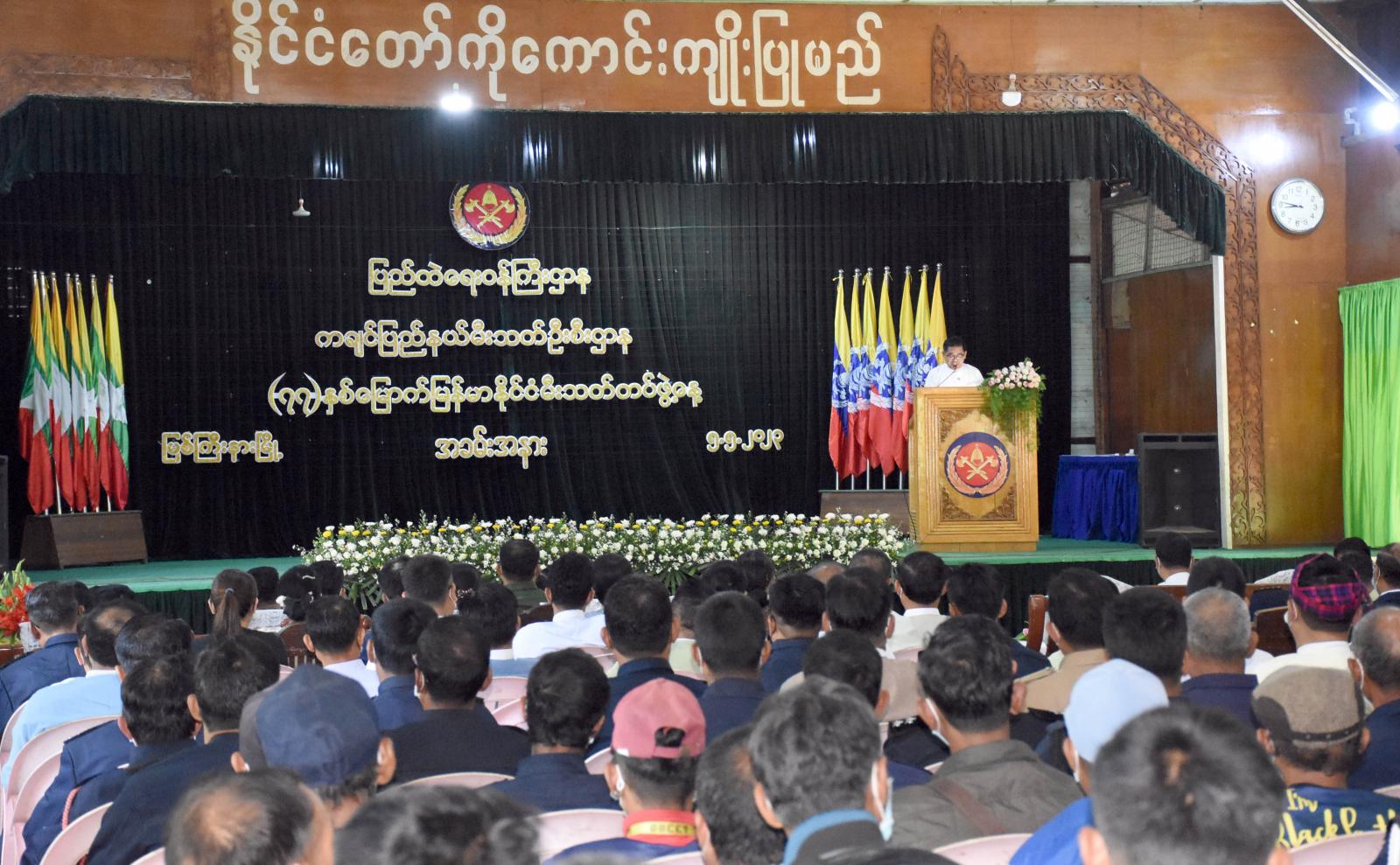 ရှေးဦးစွာ အခမ်းအနားကို အဆိုပါကျောင်းဝင်းအတွင်းရှိ အေးမြသီတာခန်းမ၌ ကျင်းပပြုလုပ်ရာ ပြည်နယ်ဝန်ကြီးချုပ် ဦးခက်ထိန်နန်က မီးသတ်တပ်ဖွဲ့ဝင်များအနေဖြင့် ပြည်သူလူထုအပေါ် ပြုကျင့်ရမည့် ကျင့်ဝတ်(၁၀)ပါးနှင့်အညီ နေထိုင်ကျင့်ကြံပြီး ပြည်သူလူထု၏ လိုအပ်ချက်၊ အသက်အိုးအိမ် စည်းစိမ်နှင့် ဘေးန္တရာယ်အမျိုးမျိုးမှ ကာကွယ်ဆောင်ရွက်ပေးကြရေး၊ ဒါ့အပြင် ပြောင်းလဲတိုးတက်လာသည့် မီးသတ်လုပ်ငန်းဆိုင်ရာများကို မျက်ခြေမပြတ် လေ့လာဆည်းပူးပြီး မိမိတို့ နိုင်ငံသားများအတွက် ပြန်လည်အသုံးချနိုင်ရေး စွမ်းဆောင်ရည်မြင့်မားအောင် ကြိုးပမ်း ဆောင်ရွက်ကြရေးနှင့် ယနေ့ကျရောက်သည့် မီးသတ်တပ်ဖွဲ့နေ့တွင် ခေတ်အဆက်ဆက် တာဝန် ထမ်းဆောင်ရင်း ထိခိုက်ဒဏ်ရာရရှိသူ၊ အသက်ပေးသွားသူ တပ်ဖွဲ့ဝင်များ၏ ခမ်းနားလွန်းလှသည့် ဂုဏ်ဒြပ်ကို အလေးပြု ဦးညွှတ်ရင်း အနာဂတ်တွင် ရင်ဆိုင်ကြုံတွေ့လာနိုင်သည့် မီးဘေးနှင့် သဘာဝဘေးအန္တရာယ်ဆိုင်ရာ စိန်ခေါ်မှုများကို အနိုင်ယူကြရန်လိုကြောင်း ဂုဏ်ပြုပြောကြားသည်။