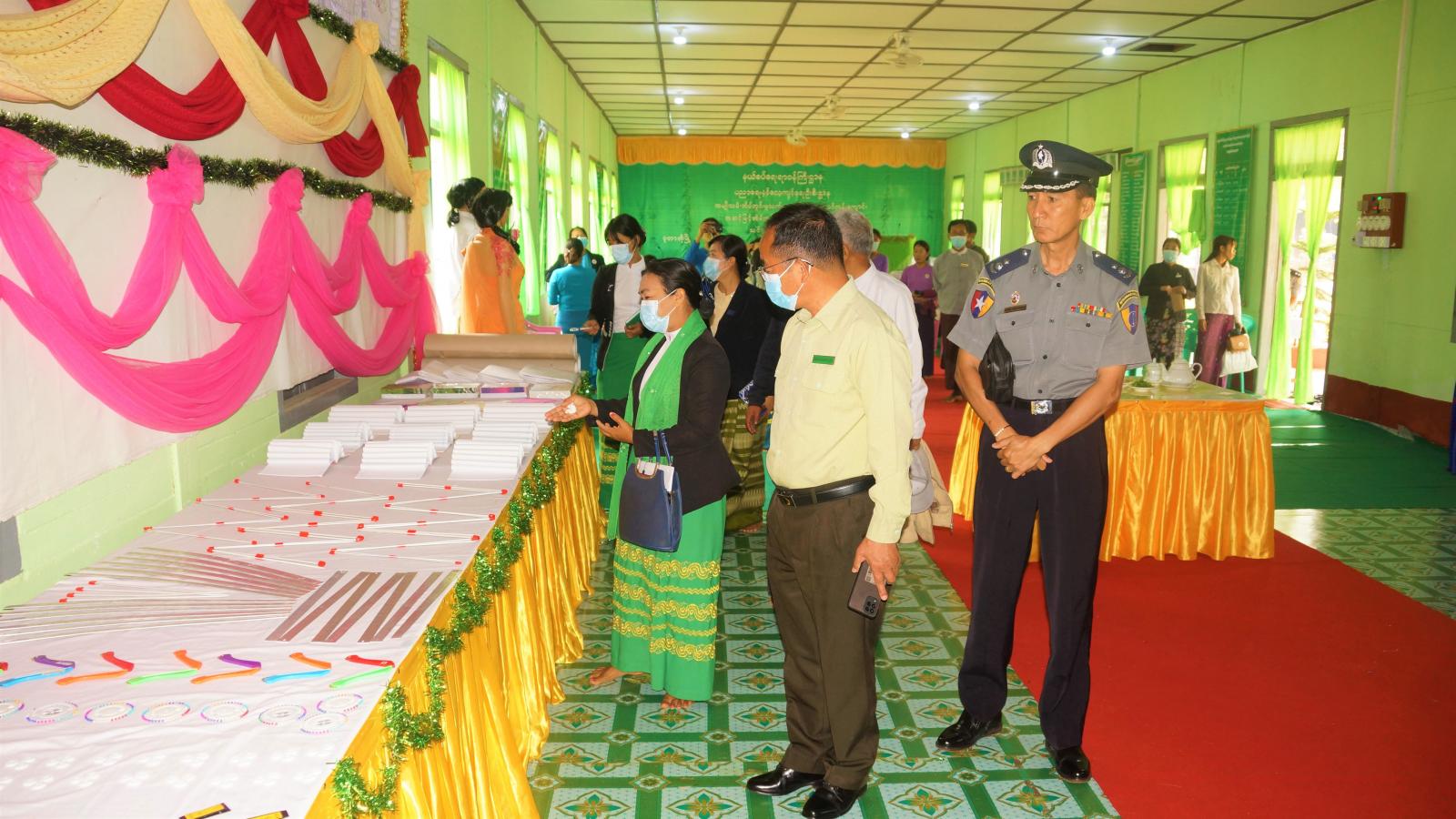 အခမ်းအနားတွင် ခရိုင်စီမံအုပ်ချုပ်ရေးအဖွဲ့ဉက္ကဋ္ဌ ဦးခေါင်လန်ဒီးက နယ်စပ်ဒေသတိုင်းရင်းသူလေးများအတွက် အိမ်တွင်း အသက်မွေးမှုအတတ်ပညာများ တိုးပွားစေရုံသာမက လူနေမှုအဆင့်အတန်း မြင့်မားလာစေရန်၊ ကျေးလက်ဒေသဆင်းရဲနွမ်းပါးမှု လျော့ချရေး၊ လူ့စွမ်းအားအရင်းအမြစ်များ ဖွံ့ဖြိုး တိုးတက်ရေးနှင့် အလုပ်အကိုင်အခွင့်အလမ်းများ ရရှိစေရေးအတွက် ရည်ရွယ်ဖွင့်လှစ်ရခြင်းဖြစ် ကြောင်း၊ နယ်စပ်ဒေသများတွင် မှီတင်းနေထိုင်ကြသည့် အမျိုးသမီးလေးများအနေဖြင့် အခြားနိုင်ငံ များသို့ သွားရောက်အလုပ်လုပ်ကိုင်မည့်အစား မိမိတို့တတ်မြောက်ထားသည့် အိမ်တွင်းမှုပညာရပ်များဖြင့် ကိုယ့်နိုင်ငံ၊ ကိုယ့်ဒေသအတွင်းတွင် သက်မွေးဝမ်းကျောင်းပညာရပ်များ လုပ်ကိုင်ဆောင်ရွက် နိုင်စေရန် အဓိကရည်ရွယ်ဖွင့်လှစ်ရခြင်း ဖြစ်ကြောင်း၊ အဆိုပါ သင်တန်းကို မွန်မြတ်သည့် ရည်ရွယ်ချက်(၅)ရပ်ဖြင့် ဖွင့်လှစ်ထားခြင်းဖြစ်ပြီး သင်တန်းသူများအနေဖြင့် သင်တန်းက ပို့ချပေးသည့် ဘာသာရပ်များကို အထူးကြိုးစားလေ့လာသင်ယူသွားကြရန် တိုက်တွန်းမှာကြားလိုကြောင်း အမှာ စကားပြောကြားပြီး ခရိုင်စီမံအုပ်ချုပ်ရေးအဖွဲ့ဥက္ကဋ္ဌနှင့် တာဝန်ရှိသူများသည် သင်တန်းသူများအား ထောက်ပံ့မည့် သင်ထောက် ကူပစ္စည်းများ ခင်းကျင်းပြထားရှိမှုများကို ကြည့်ရှုအားပေးကြရာ သင်တန်းကျောင်း ကျောင်းအုပ်ဆရာမကြီး ဒေါ်ခင်ဌေးရီက လိုက်လံရှင်းလင်းပြသသည်။