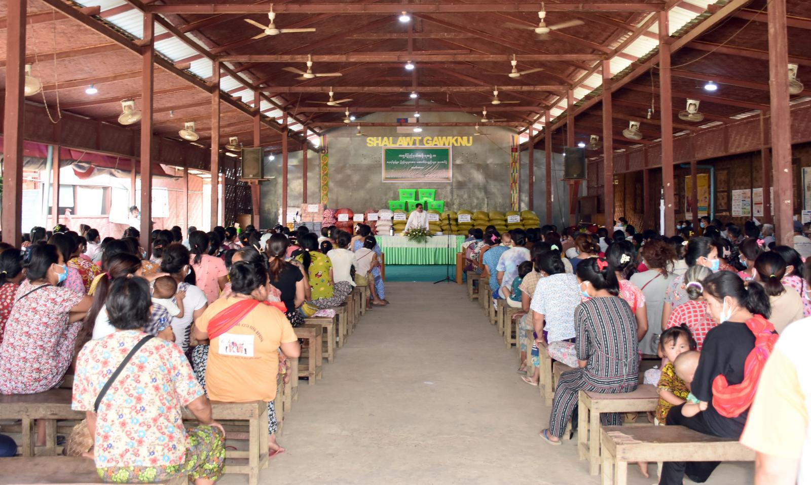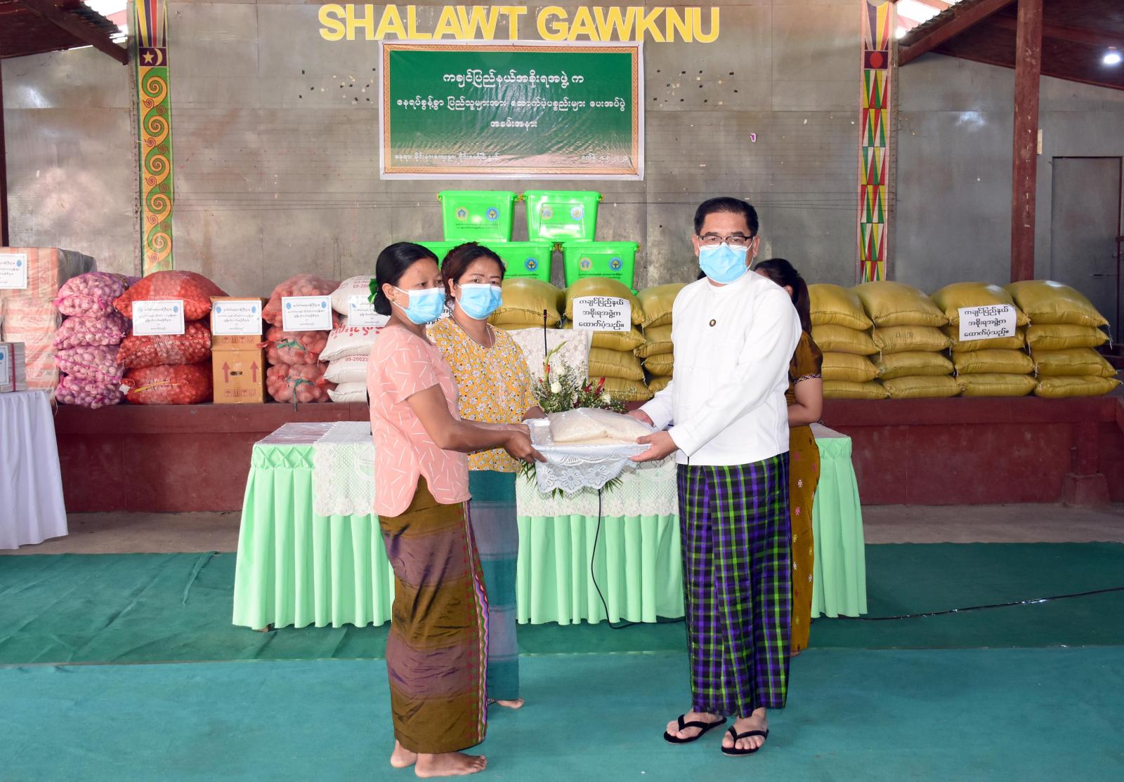 ထို့နောက် ပြည်နယ်ဝန်ကြီးချုပ်၊ ပြည်နယ်တရားလွှတ်တော်တရားသူကြီးချုပ်၊ ပြည်နယ် ဝန်ကြီးများက အဆိုပါ မိုင်းနားဖွံ့ဖြိုးရေးခြံ KBC စခန်းရှိ အိမ်ထောင်စု (၃၀၈)စု၊ လူဦးရေ (၁၆၀၉) ဦး တို့အတွက် ပြည်နယ်အစိုးရအဖွဲ့မှ ဆန်အိတ်(၄၈၆)အိတ်၊ ဘေးအန္တရာယ်ဆိုင်ရာစီမံခန့်ခွဲမှုဦးစီးဌာနမှ ဆန်ရိက္ခာ (၂)ပတ်စာအတွက် ထောက်ပံ့ငွေကျပ် စုစုပေါင်း (၆၇၅၇၈၀၀) ကျပ်နှင့် နယ်စပ်ရေးရာ ဝန်ကြီးဌာနမှ ထောက်ပံ့သည့် ငွေကျပ် ၇၅၀၀၀၀၀ တန်ဖိုးရှိ အာလူး၊ ကြက်သွန်နီ၊ ကြက်သွန်ဖြူ၊ ကုလားပဲစသည့် အခြေခံစားသောက်ကုန်များနှင့် ကျောင်းသုံးဗလာစာအုပ်များ၊ ကျောင်းဝတ်စုံများကို ထောက်ပံ့ပေးအပ်ခဲ့ကြသည်။