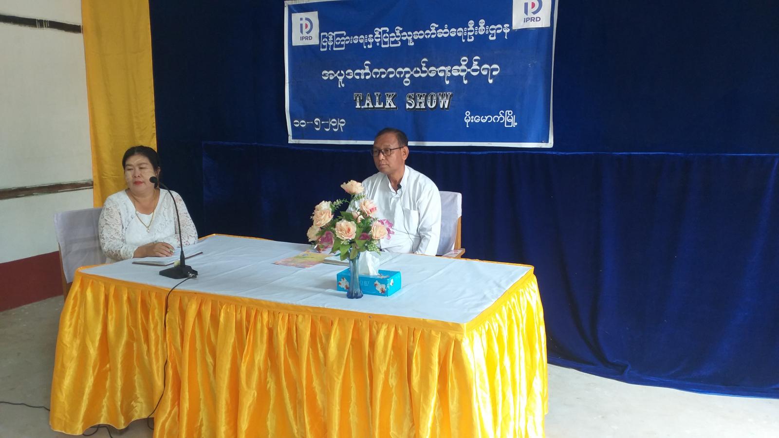 ကချင်ပြည်နယ်၊ ဗန်းမော်ခရိုင်၊ မိုးမောက်မြို့နယ် ပြန်ကြားရေးနှင့်ပြည်သူ့ဆက်ဆံရေးဦးစီးဌာန Community Centre ခန်းမ၌ ယနေ့နံနက် (၁၀)နာရီအချိန်တွင် မြို့နယ် ပြန်ကြားရေးနှင့်ပြည်သူ့ဆက်ဆံရေးဦးစီးဌာနနှင့် မြို့နယ်ကျန်းမာရေးဦးစီးဌာနတို့ ပူးပေါင်း၍ အပူဒဏ် ကာကွယ်ရေးဆိုင်ရာ Talk Show ဆောင်ရွက်ခဲ့ကြောင်း သိရှိရသည်။