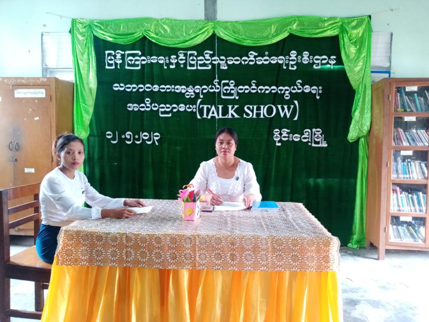 အဆိုပါ ဆွေးနွေးပွဲတွင် ပြန်ကြားရေးနှင့်ပြည်သူ့ဆက်ဆံရေးဦးစီးဌာနမှ မြို့နယ်ဦးစီးမှူး ဒေါ်မြင့်မြင့်သွယ်က (Talk Show) ဆွေးနွေးပွဲ ပြုလုပ်ရခြင်း၏ ရည်ရွယ်ချက်ကို ရှင်းလင်းပြောကြားပြီးနောက် သဘာဝဘေး အန္တရာယ်ကျရောက်ပါက သဘာဝဘေးအန္တရာယ် ကာကွယ်ရေးစီမံထားချက်များ၊ မုန်တိုင်းအတွက် သတိပြုလိုက်နာရန် အချက်များကို လည်းကောင်း၊ စာကြည့်တိုက်မှူး ဒေါ်မို့မို့က မုန်တိုင်းမကျရောက်မီ ဆောင်ရွက်ရမည့် အချက်များ၊ မုန်တိုင်းအန္တရာယ်ကျရောက်ပြီးပါက လိုက်နာရန်အချက်များစသည့် သဘာဝဘေးအန္တရာယ်နှင့်ပတ်သက်သည့် အကြောင်းအရာများကို ဆွေးနွေးခဲ့ကြကြောင်း သိရသည်။