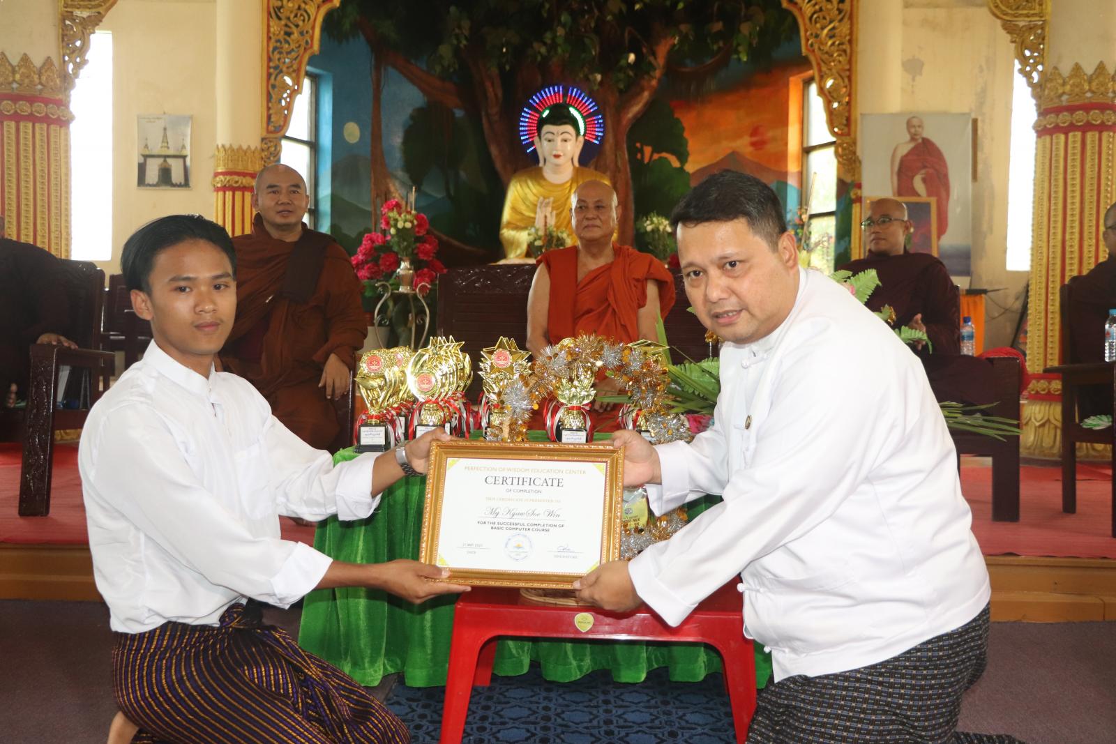 ထို့နောက် ပြည်နယ်လူမှုရေးရာဝန်ကြီးက သားသမီးများအနေဖြင့် ယဥ်ကျေးလိမ္မာမှုသည် ကိုယ်ကျင့်တရားဖြစ်ပြီး နေ့စဥ်လူနှင့် လူအချင်းချင်းဆက်ဆံရာတွင် ကိုယ်ကျင့်တရားသည် အလွန်အရေးကြီးပါကြောင်း၊ ယဥ်ကျေးလိမ္မာပြီး ကိုယ်ကျင့်တရားကောင်းမွန် သည့် လူတော်လူကောင်းများ ဖြစ်လာရန် ကြိုးစားကြစေလိုကြောင်း ပြောကြားပြီး ပြည်နယ်ဝန်ကြီးနှင့် တာဝန်ရှိသူများက ကွန်ပျူတာ သင်တန်းဆင်း ကျောင်းသား/ ကျောင်းသူများအား ဆုတံဆိပ်နှင့် အောင်လက်မှတ်များကို ပေးအပ် ချီးမြှင့်သည်။