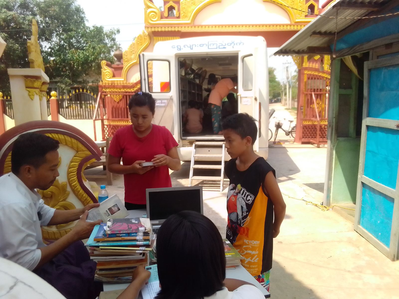 ပျဉ်းမနားမြို့နယ် ပြန်ကြားရေးနှင့်ပြည်သူ့ဆက်ဆံရေးဦးစီးဌာနမှ ရွေ့လျားစာကြည့်တိုက် မော်တော်ယာဉ်ဖြင့် စာဖတ်သူများ လက်ဝယ်အရောက် စာအုပ်များ လိုက်လံငှားရမ်းပေးမှုကို ရပ်ကွက်/ကျေးရွာများအရောက် လိုက်လံငှားရမ်းပေးနေလျက်ရှိရာ ယနေ့ နံနက်ပိုင်းတွင် မြို့နယ်ရုံးဝန်ထမ်းများက သဲကျွန်းကျေးရွာသို့ သွားရောက် ငှားရမ်းပေးကြသည်။