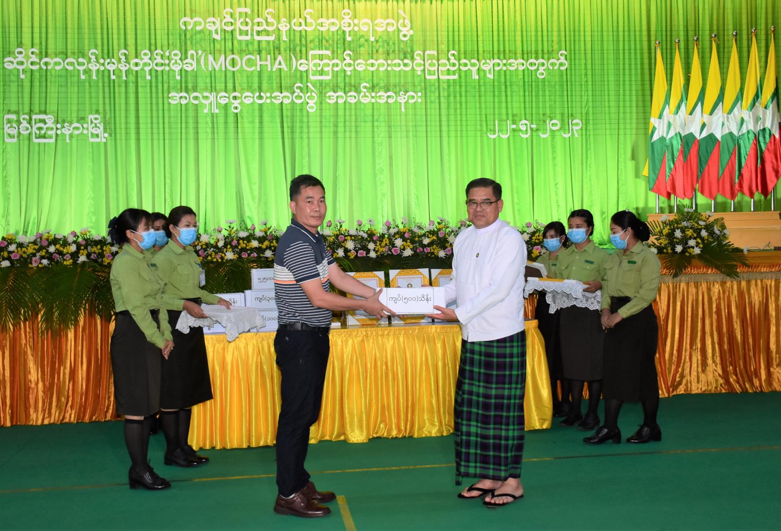 ထို့နောက် သဘာဝဘေးသင့်ဒေသများရှိ ပြည်သူများအတွက် ပြည်နယ်ဝန်ကြီးချုပ်က ပြည်နယ်ဘဏ္ဍာငွေရှာဖွေရေးနှင့် ရန်ပုံငွေ ထိန်းသိမ်းရေးလုပ်ငန်းကော်မတီဥက္ကဋ္ဌ၊ ပြည်နယ်စီးပွားရေးရာဝန်ကြီး ဦးမျိုးဆွေထံ ငွေကျပ် ၁၅ သိန်းကို ပေးအပ်လှူဒါန်းပြီး ဂုဏ်ပြုမှတ်တမ်းလွှာပြန်လည် လက်ခံရယူကာ ပြည်နယ်တရားလွှတ်တော်တရားသူကြီးချုပ်၊ ပြည်နယ်အစိုးရအဖွဲ့ဝင် ဝန်ကြီးများ၊ ပြည်နယ်ဥပဒေချုပ်နှင့် ဌာနဆိုင်ရာအဖွဲ့အစည်းများ၊ ဒေသခံကုမ္ပဏီလုပ်ငန်းရှင်များ၊ စေတနာ့အလှူရှင်များက စုစုပေါင်းလှူဒါန်း ငွေကျပ် ၃၄၀၇၈၁၆၀၀ (ကျပ်သုံးထောင်လေးရာခုနှစ်သိန်း ရှစ် သောင်းတစ်ထောင်ခြောက်ရာ)ကို လှူဒါန်းကြရာ ပြည်နယ်ဝန်ကြီး ချုပ်၊ မြောက်ပိုင်းတိုင်းစစ်ဌာနချုပ် တိုင်းမှူး ဗိုလ်ချုပ်ကိုကိုမောင်၊ တိုင်းစစ်ဦးစီးချုပ် ဗိုလ်မှူးချုပ် မြတ်သူစိုး၊ ပြည်နယ်အစိုးရအဖွဲ့ဝင် ဝန်ကြီးများက လက်ခံရယူခဲ့ကြပြီး ဂုဏ်ပြုမှတ်တမ်းလွှာများကို အသီးသီးပြန်လည် ပေးအပ်ခဲ့ကြသည်။