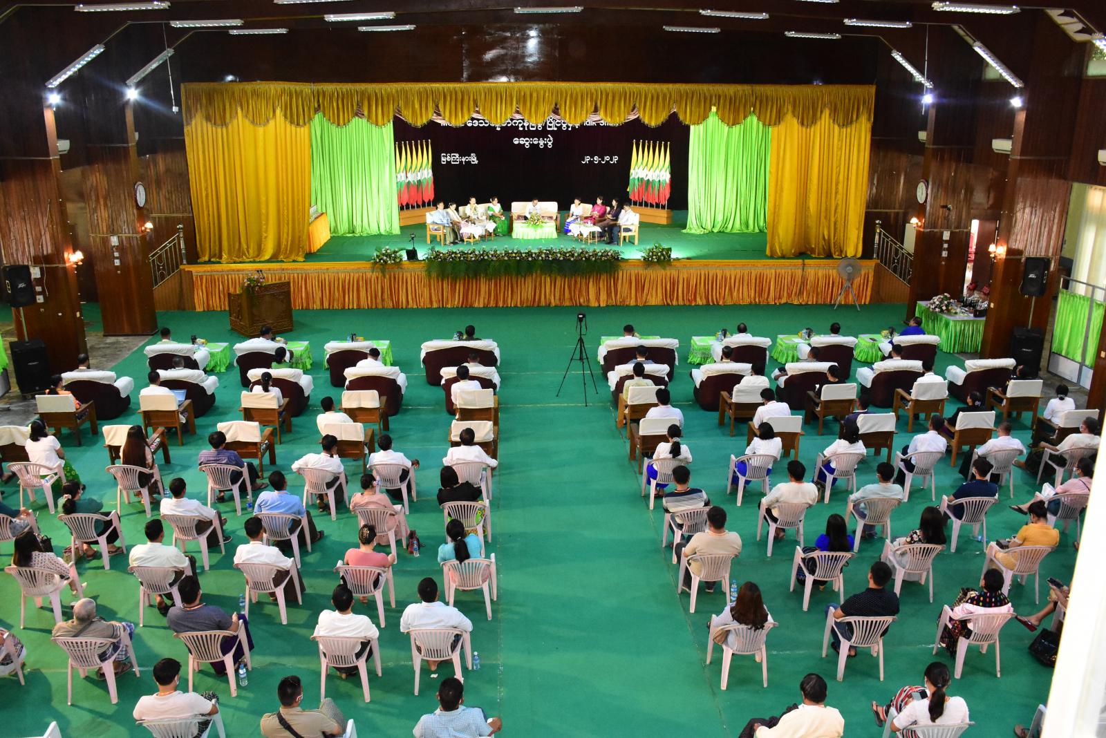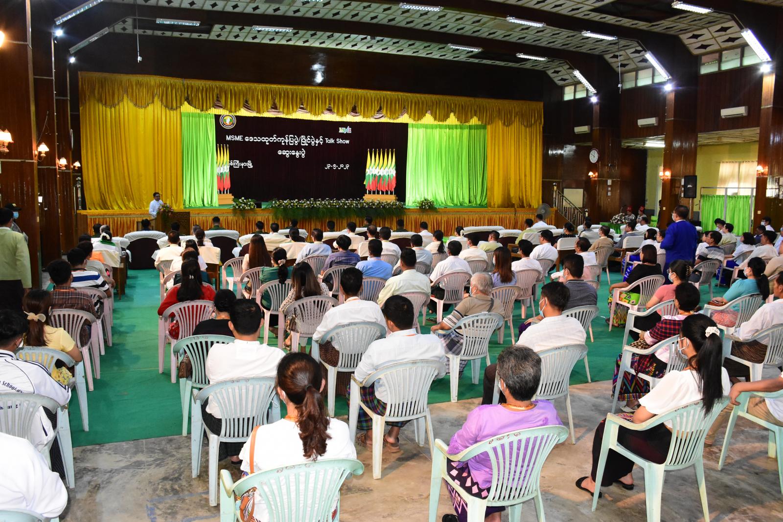 ယင်းနောက် မြို့တော်ခန်းမအတွင်း၌ MSME Talk Show ဆွေးနွေးပွဲကို ဆက်လက်ကျင်းပရာ ပြည်နယ်စက်မှုကြီးကြပ်ရေးနှင့်စစ်ဆေးရေးဦးစီးဌာန၊ ပြည်နယ်ဦးစီးမှူးက ဦးဆောင်၍ မြန်မာ့စီးပွား ရေးဘဏ်မှ ပြည်နယ်ဘဏ်မန်နေဂျာ၊ ပြည်နယ်အသေးစားစက်မှုလက်မှုလုပ်ငန်းဦးစီးဌာန၊ အစားအသောက်နှင့်ဆေးဝါးကွပ်ကဲရေးဦးစီးဌာန၊ စားသုံးသူရေးရာဦးစီးဌာနတို့မှ ပြည်နယ်ဦးစီးမှူး များနှင့် တာဝန်ရှိသူများက MSME လုပ်ငန်းများဖွံ့ဖြိုးတိုးတက်ရေးအတွက် ဌာနဆိုင်ရာများ၏ ဥပဒေ၊ မူဝါဒဆိုင်ရာလုပ်ထုံးလုပ်နည်းများ၊ ပံ့ပိုးကူညီဆောင်ရွက်ပေးလျက်ရှိသည့်ကိစ္စရပ်များ၊ ချေးငွေ ဆိုင်ရာကိစ္စရပ်များကို လည်းကောင်း၊ စီးပွားရေးလုပ်ငန်းရှင်များက ဖြတ်သန်းကြုံတွေ့ခဲ့ရသည့် အခက်အခဲများနှင့် လုပ်ငန်းအတွေ့အကြုံများကို ရှင်းလင်းဆွေးနွေးခဲ့ကြပြီး၊ တက်ရောက်လာကြသူ များက သိရှိလိုသည်များနှင့်စပ်လျဉ်း၍ မေးမြန်းဆွေးနွေးကြရာ ဌာနဆိုင်ရာများက သက်ဆိုင်ရာ ကဏ္ဍအလိုက် ပြန်လည်ရှင်းလင်း ဆွေးနွေးခဲ့သည်။
