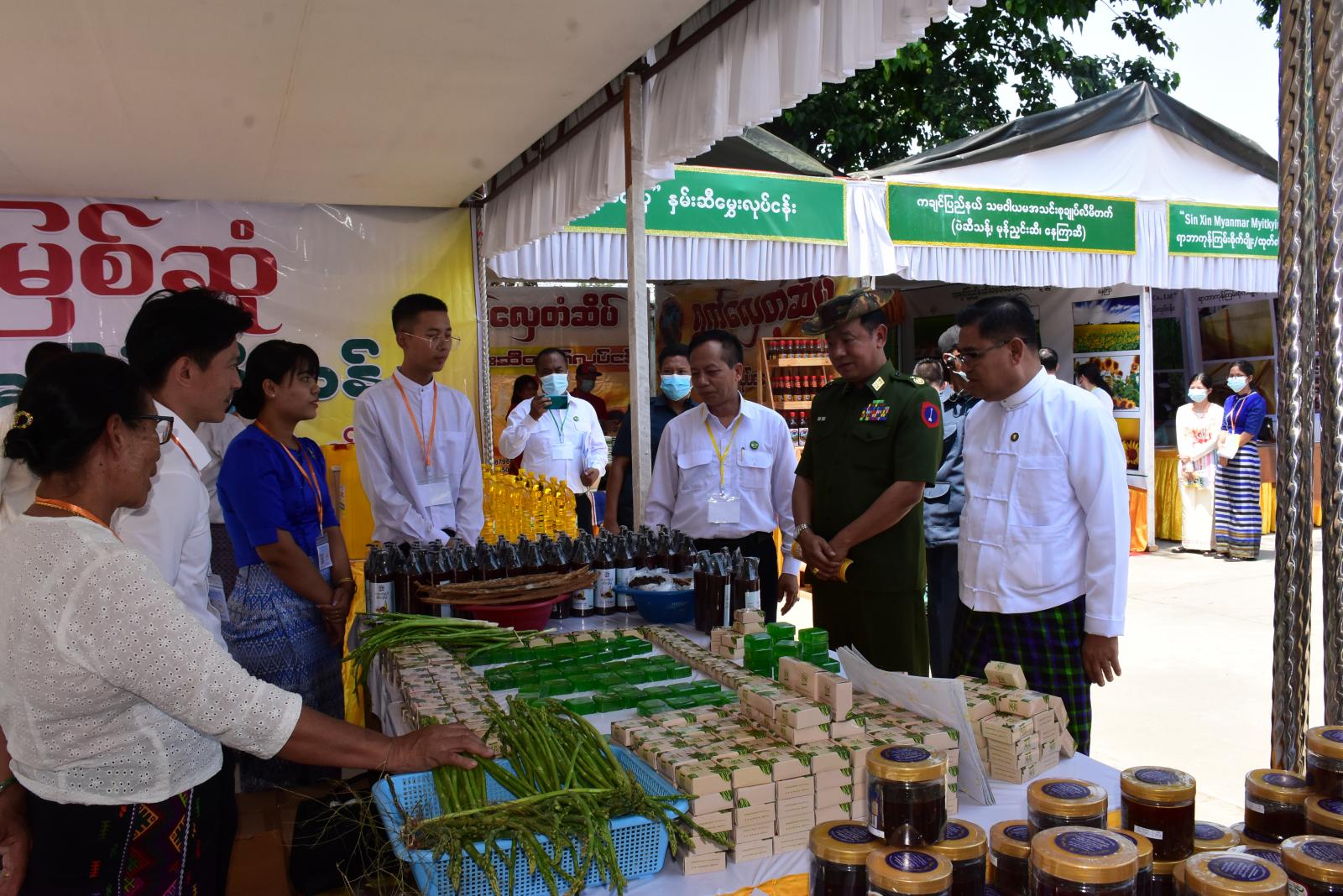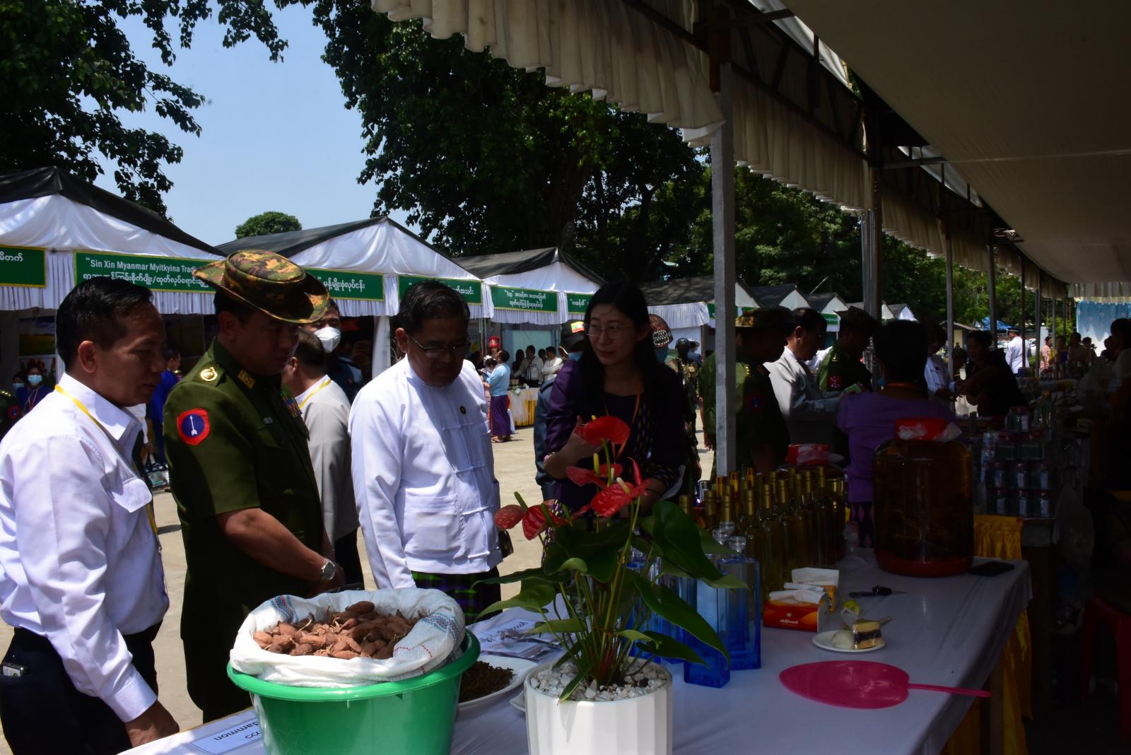 ထို့နောက် ပြည်နယ်အေဂျင်စီ အတွင်းရေးမှူး၊ ပြည်နယ်စက်မှုကြီးကြပ်ရေးနှင့်စစ်ဆေးရေး ဦးစီးဌာန၊ ပြည်နယ်ဦးစီးမှူးဦးဝင်းနိုင်က MSME ဒေသထုတ်ကုန်ပြပွဲ/ပြိုင်ပွဲနှင့် Talk Show အစီအ စဉ်ကျင်းပပြုလုပ်ရခြင်းနှင့်စပ်လျဉ်း၍ ရှင်းလင်းတင်ပြပြီး၊ ပြည်နယ်ဝန်ကြီးချုပ်နှင့် မြောက်ပိုင်းတိုင်း စစ်ဌာနချုပ်မှတိုင်းမှူးဗိုလ်ချုပ် ကိုကိုမောင်၊ ပြည်နယ်တရားလွှတ်တော် တရားသူကြီးချုပ်၊ ပြည်နယ်ဝန်ကြီးများ၊ ဌာနဆိုင်ရာတာဝန်ရှိသူများသည် မြို့တော်ခန်းမဝင်းအတွင်း ဒေသတွင်း စီးပွားရေးလုပ်ငန်းရှင်များက ခင်းကျင်းပြသထားသည့် ပြည်နယ်၏ ဒေသထွက်ရိုးရာ ရက်ကန်း ထည်များ၊ စားသောက်ကုန်ပစ္စည်းများ၊ အလှကုန်များ၊ စိုက်ပျိုးမွေးမြူရေး ထွက်ကုန်ပစ္စည်းများ၊ ပယင်းအချောထည်များ၊ သဘာဝမြေသြဇာ၊ ရာဘာ၊ ရေခဲတောင်ဒေသထွက်ဆေးဝါးပစ္စည်းများ၊ တိုင်းရင်းဆေးဝါးပစ္စည်းများနှင့် စားသုံးဆီစသည့် MSME လုပ်ငန်းထုတ်ကုန်ပြခန်း (၃၂)ခန်းကို လှည့်လည်ကြည့်ရှုအားပေးခဲ့ကြသည်။