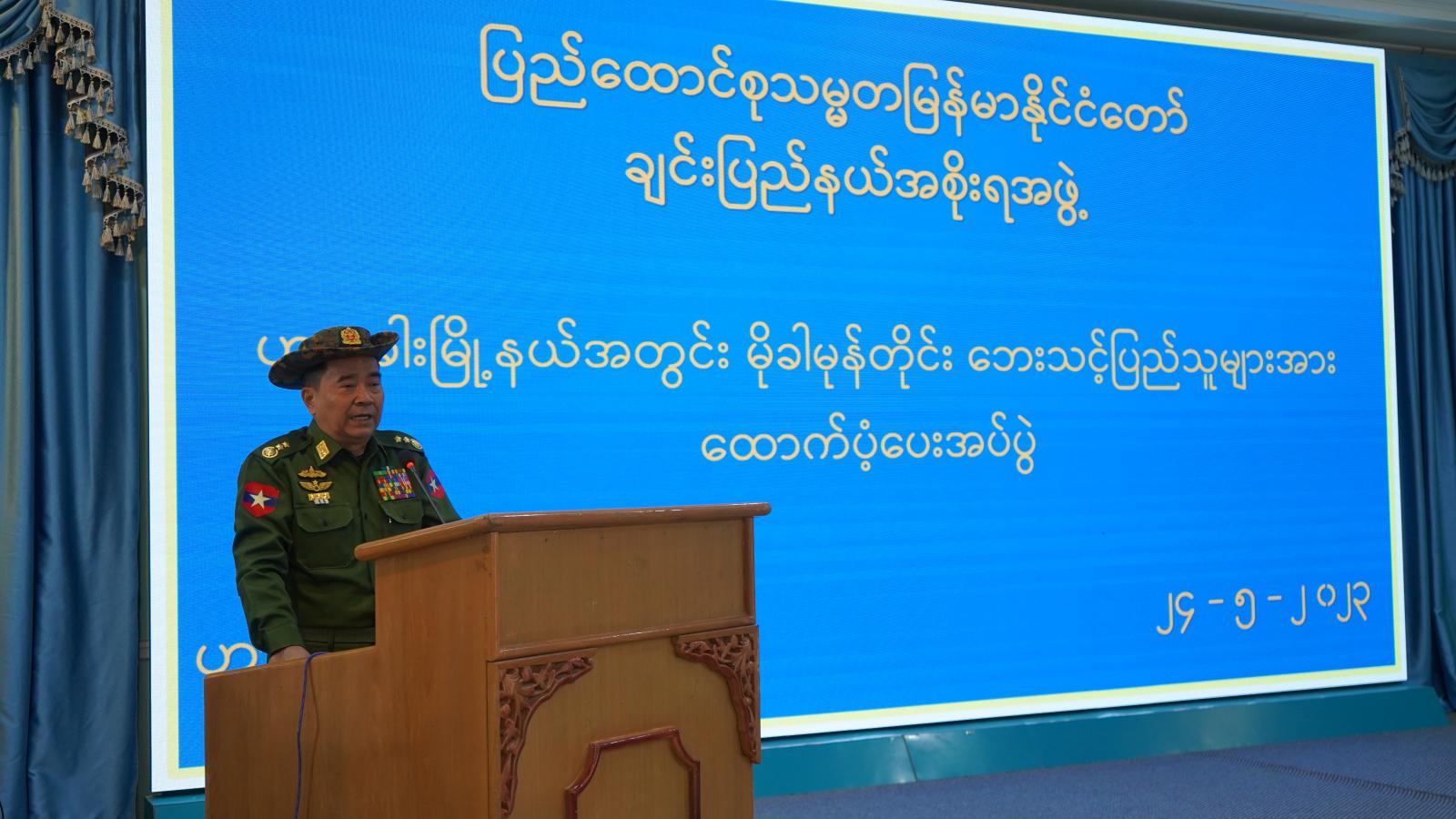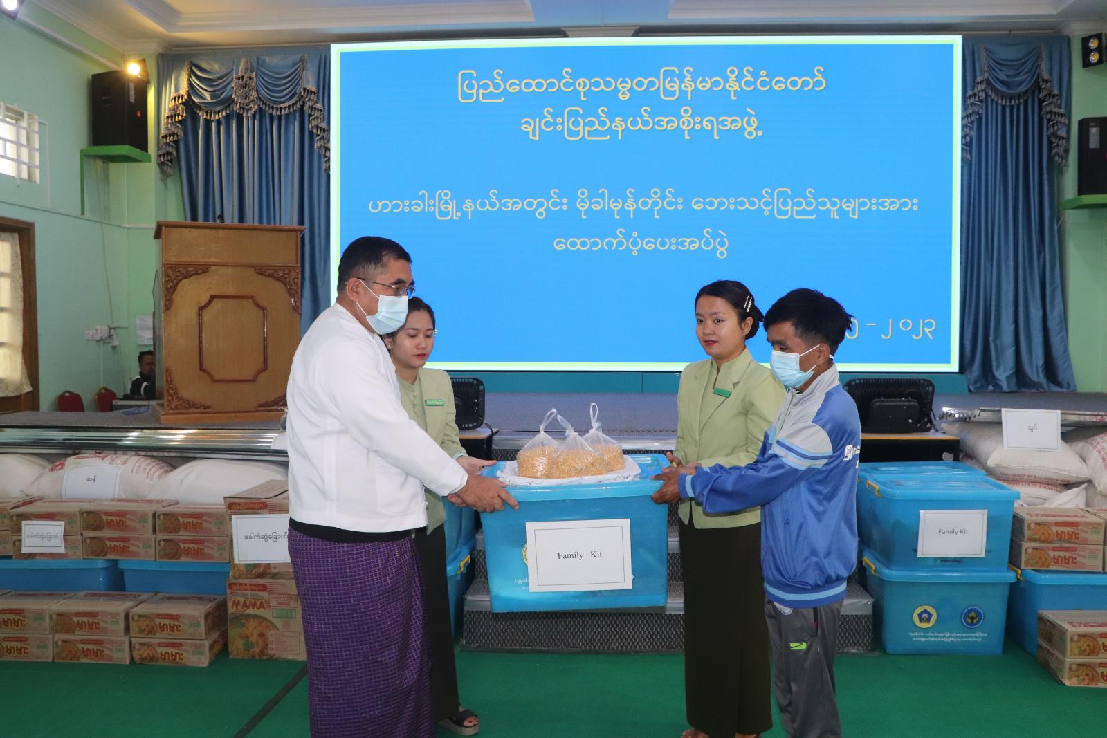 ချင်းပြည်နယ်၊ ဟားခါးမြိုနယ်အတွင်းရှိ မိုခါမုန်တိုင်းဘေးသင့်ပြည်သူများအား ထောက်ပံ့ပစ္စည်းပေးအပ်ပွဲကို ယနေ့ နံနက် ၁၀ နာရီက ဟားခါးမြို့၊ ချင်းပြည်နယ်အစိုးရအဖွဲ့ရုံးရှိ ပြည်နယ်အထွေထွေအုပ်ချုပ်ရေးဦးစီးဌာနခန်းမ၌ ကျင်းပရာ အခမ်းအနားသို့ ကာကွယ်ရေးဝန်ကြီးဌာနမှ ဒုတိယဗိုလ်ချုပ်ကြီးမင်းနိုင်၊ ချင်းပြည်နယ်အစိုးရအဖွဲ့ ပြည်နယ်ဝန်ကြီးချုပ် ဒေါက်တာ ဝုန်ဆွန်းထန်၊ အနောက်မြောက်တိုင်းစစ်ဌာနချုပ် ဒုတိယတိုင်းမှူး ဗိုလ်မှူးချုပ် မျိုးထွဋ်လှိုင်၊ ပြည်နယ်တရားလွှတ်တော် တရားသူကြီးချုပ် ဦးနေစိုး၊ ပြည်နယ်အစိုးရအဖွဲ့ဝင် ဝန်ကြီးများ၊ ပြည်နယ်ဥပဒေချုပ်၊ ပြည်နယ်အစိုးရအဖွဲ့ အတွင်းရေးမှူး၊ ပြည်နယ်၊ ခရိုင်၊ မြို့နယ်အဆင့် ဌာနဆိုင်ရာ တာဝန်ရှိသူများ နှင့် လေဘေးသင့်ပြည်သူများ တက်ရောက်ကြသည်။