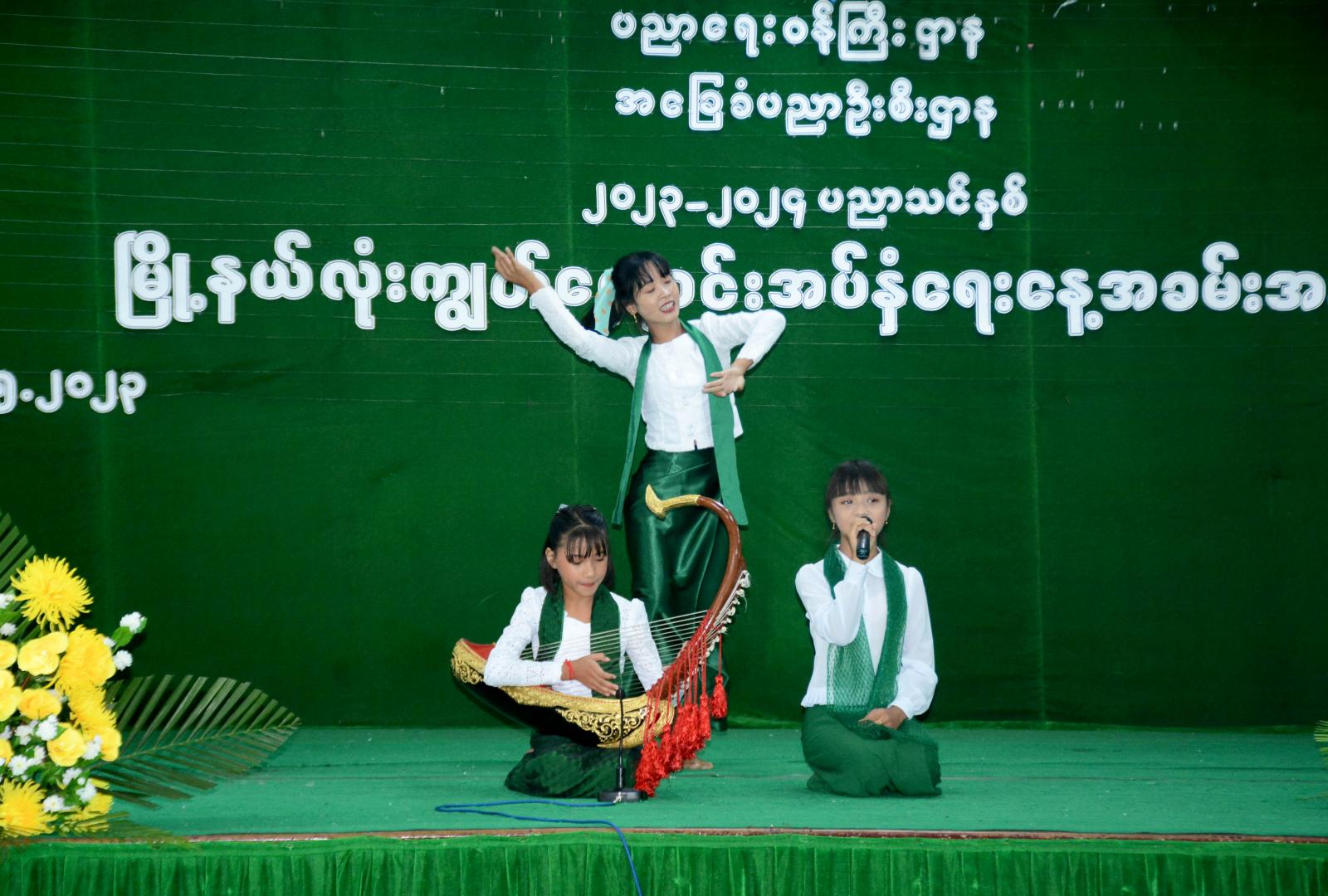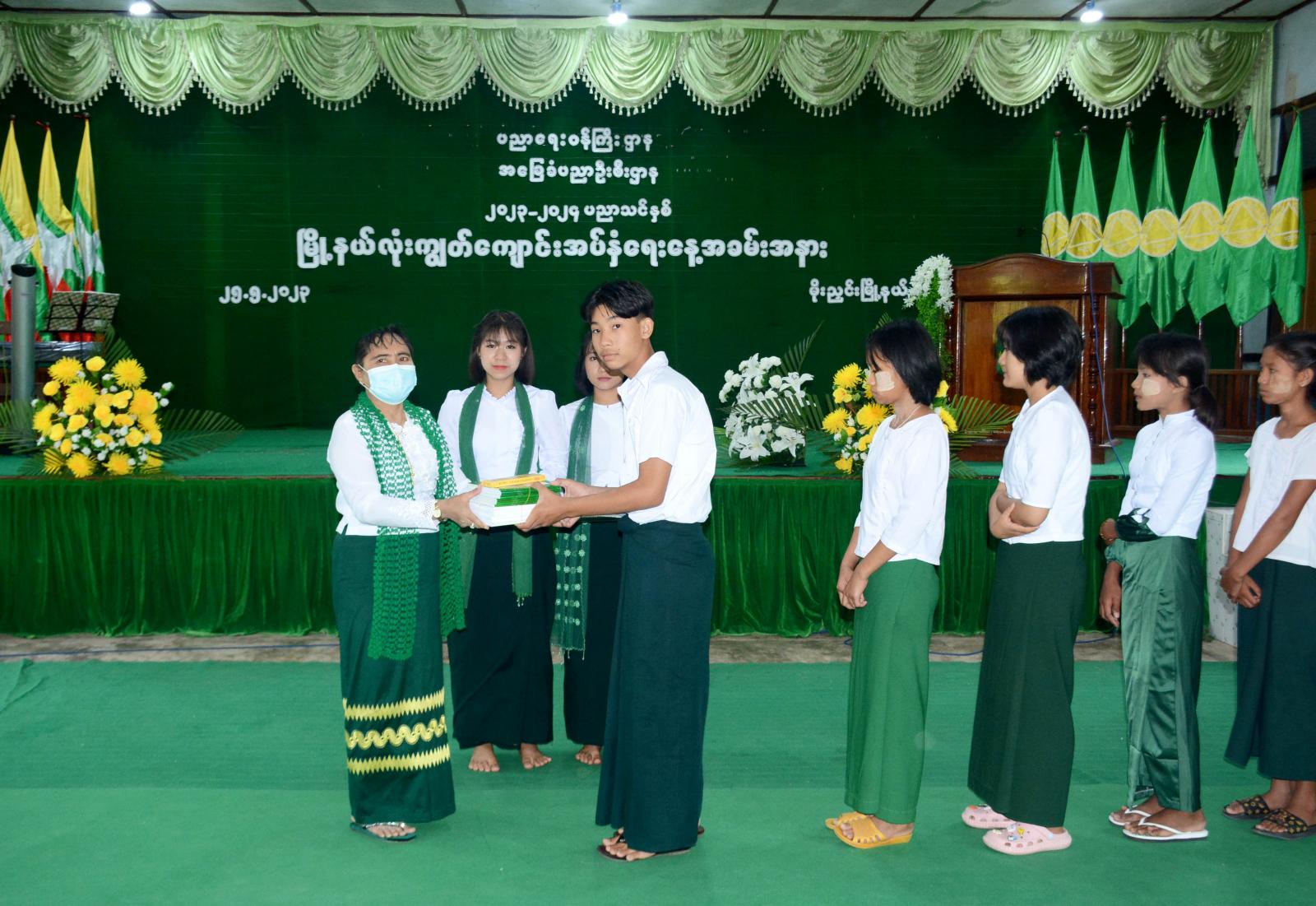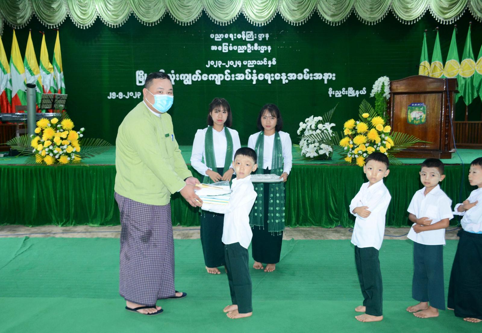 ထို့နောက် မိုးညှင်းမြို့နယ်အတွင်း ကျောင်းနေရန်အခက်အခဲရှိသော ကျောင်းသား ကျောင်းသူများအား ပုံနှိပ်၊ ဗလာ၊ ခဲတံ၊ ဘောပင်နှင့် ကျောင်းဝတ်စုံများကို အခမ်းအနားသို့ တက်ရောက်လာကြသည့် ခရိုင်/မြို့နယ်ဌာနဆိုင်ရာ တာဝန်ရှိသူများက အသီးသီးပေးအပ် လှူဒါန်းခဲ့ကြပြီး ကျောင်းသား ကျောင်းသူများက “မြမန်းဂီရိ” တေးသရုပ်ဖော်အကနှင့် “မြန်မာ့ကျောင်း” တေးသီချင်းတို့ဖြင့် ဖျော်ဖြေခဲ့ကြကြောင်း သိရသည်။