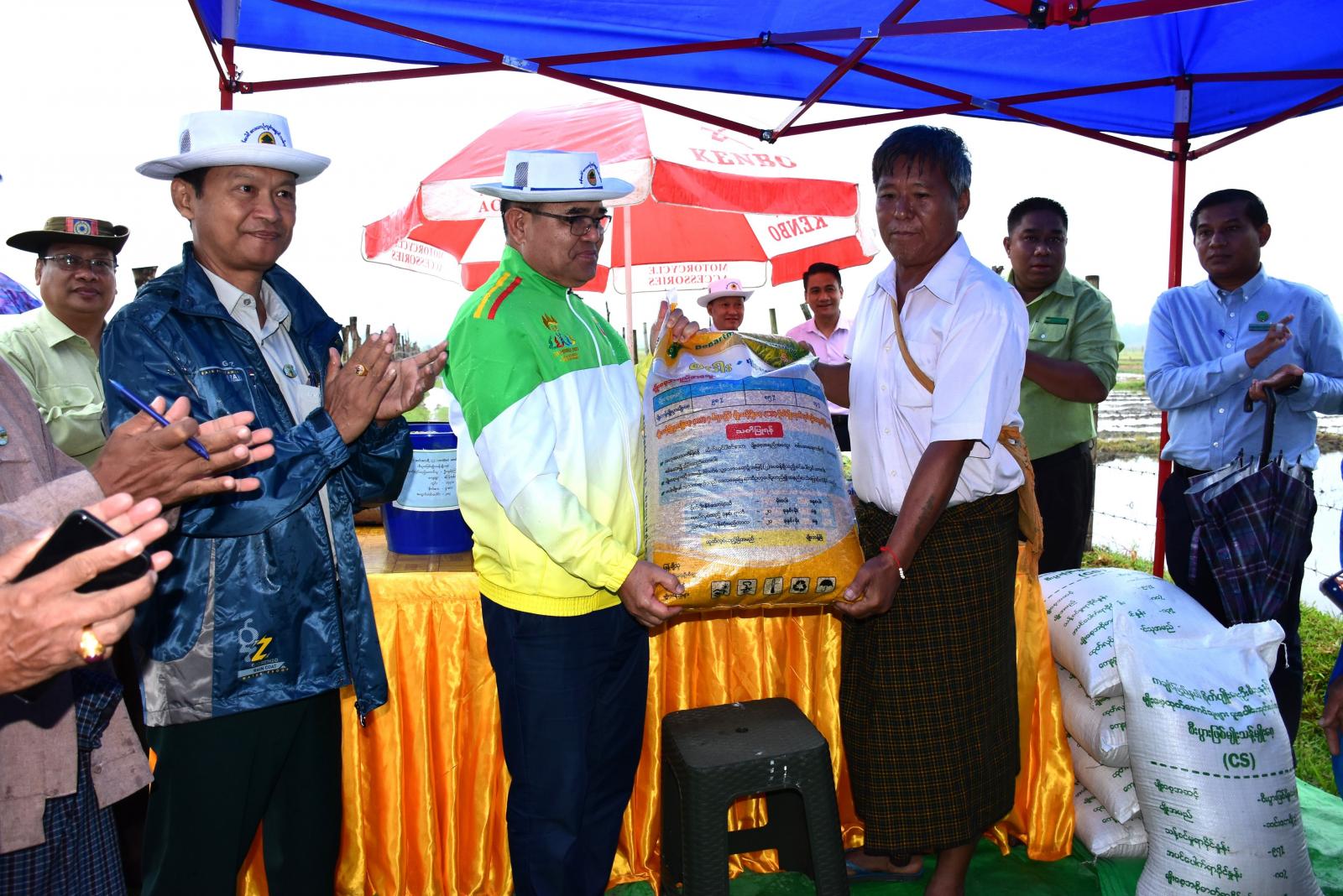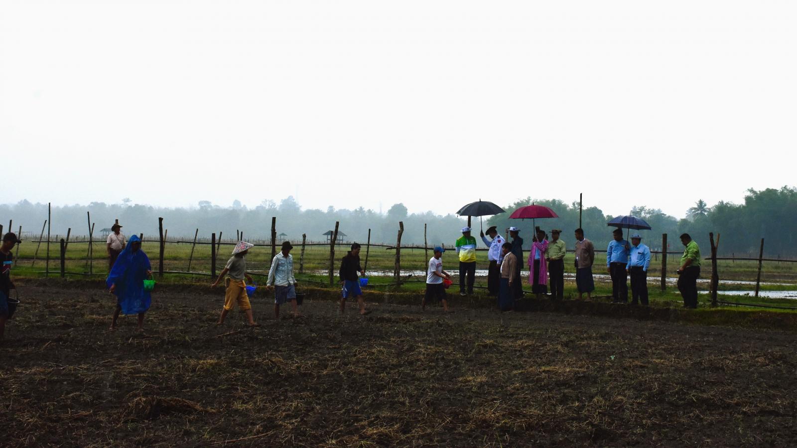 ထို့နောက် ပြည်နယ်ဝန်ကြီးချုပ်သည် ပြည်နယ်ဝန်ကြီးများ၊ ဌာနဆိုင်ရာတာဝန်ရှိသူများ၊ ဒေသခံ တောင်သူများနှင့်အတူ လယ်စိုက်ခင်းအတွင်း တောင်သူများ၏ ပိုက်ဆံလျှော်(သစ်စိမ်းမြေသြ ဇာ) မျိုးစေ့များစုပေါင်းကြဲပက်ခြင်း သရုပ်ပြသမှုကို ကြည့်ရှုအားပေးခဲ့ကြပြီး ပြည်နယ်ဝန်ကြီးချုပ်က မိုးစပါးအပြင် သီးထပ်သီးနှံများ စိုက်ပျိုးနိုင်ရေး တာဝန်ရှိသူများနှင့် ပေါင်းစပ်ဆောင်ရွက်ပေးခဲ့သည်။