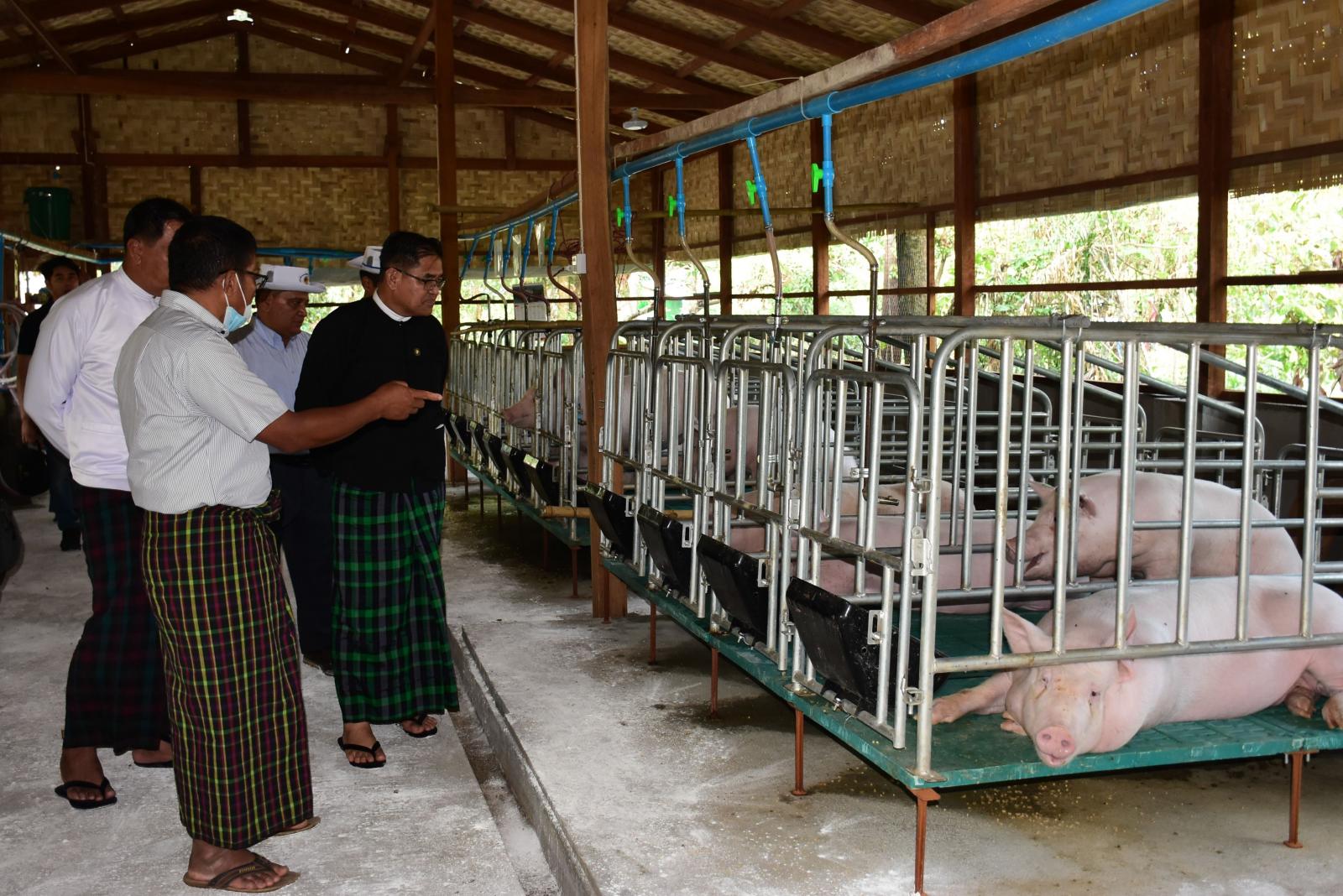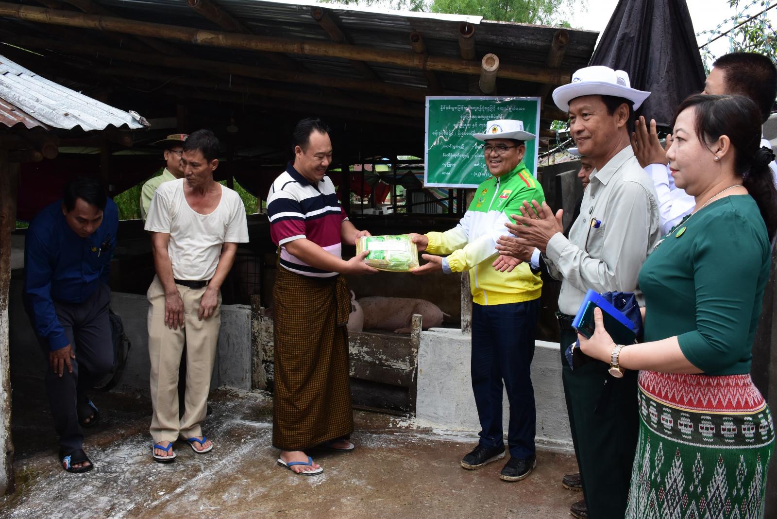 ထို့နောက် (၂)မိုင်အောင်သာရပ်ကွက်အတွင်းရှိ ပိုင်ရှင်ဦးနော်လီ၏ခြံ၌ အဆိုပါရပ်ကွက် အတွင်း နိုင်ငံ့စီးပွားမြှင့်တင်ရေးရန်ပုံငွေဖြင့်မွေးမြူရေးလုပ်ငန်းဆောင်ရွက်ကြသည့် ကျေးရွာလုပ်ငန်း စီမံကိန်းကြီးကြပ်မှုကော်မတီအဖွဲ့ဝင်များနှင့် ရင်းရင်းနှီးနှီး မိတ်ဆက်တွေ့ဆုံကာ မွေးမြူရေး အထောက်အကူပြုဆေးဝါးပစ္စည်းကို ထောက်ပံ့ပေးအပ်ခဲ့ပြီး ခြံဝင်းအတွင်း နိုင်ငံ့စီးပွားမြှင့်တင်ရေး ရန်ပုံငွေကျပ် (၂၄)သိန်းဖြင့် ဝက်များမွေးမြူထားရှိမှု အခြေအနေနှင့် စီးပွားဖြစ်ထွန်းအောင်မြင်မှု အခြေအနေများကို မေးမြန်းဆွေးနွေးခဲ့ကြပြီး လိုအပ်သည်များကို ပေါင်းစပ်ဆောင်ရွက်ပေးခဲ့သည်။