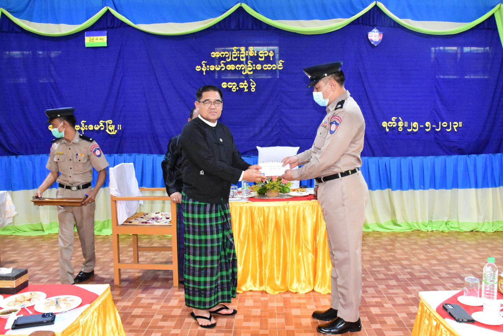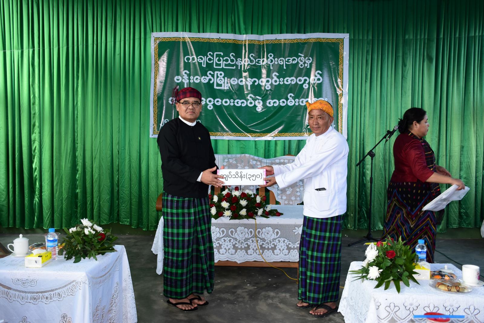 ထို့နောက် အလှူငွေများကို ပေးအပ်လှူဒါန်းရာ ပြည်နယ်ဝန်ကြီးချုပ်က ငွေကျပ်သိန်း ၃၅၀၊ ပြည်နယ်တိုင်းရင်းသားရေးရာဝန်ကြီးက ငွေကျပ်သိန်း ၁၀၀၊ စီးပွားရေးလုပ်ငန်းရှင်များက စုစုပေါင်း ငွေကျပ်သိန်း ၁၂၇၀ ကို အသီးသီးပေးအပ်လှူဒါန်းကြရာ ကော်မတီဥက္ကဋ္ဌနှင့် တာဝန်ရှိသူများက လက်ခံရယူခဲ့ကြပြီး ပြည်နယ်ဝန်ကြီးချုပ်နှင့် တာဝန်ရှိသူများအား ကချင်တိုင်းရင်းသားတို့၏ ရိုးရာမဂွန်းလစ်ဖြင့် ဂါဝရပြုခဲ့ကြသည်။