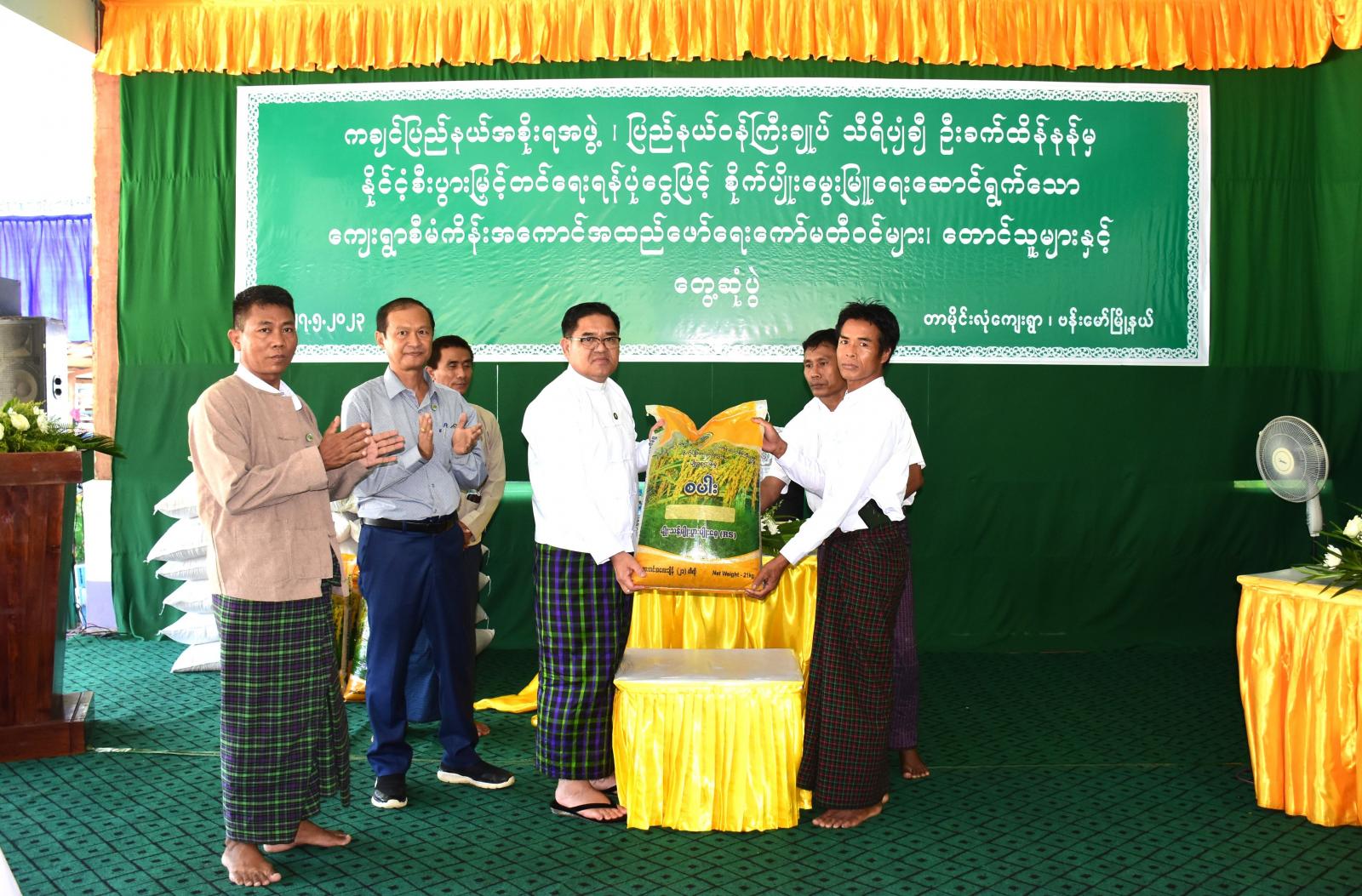 ဆက်လက်၍ ပြည်နယ်စိုက်ပျိုးရေးဦးစီးဌာန၊ ပြည်နယ်ဦးစီးမှူး ဦးဌေးလွင်က နိုင်ငံ့စီးပွားမြှင့် တင်ရေး ရန်ပုံငွေဖြင့် စိုက်ပျိုးရေးလုပ်ငန်းဆောင်ရွက်သည့် တောင်သူများအတွက် ထောက်ပံ့ ပေးအပ်သွားမည့် မျိုးစပါးမျိုးစေ့အိတ်များနှင့် စပ်လျဉ်း၍ ရှင်းလင်းတင်ပြပြီး ပြည်နယ်ဝန်ကြီးချုပ်၊ ပြည်နယ်ဝန်ကြီများနှင့် ပြည်နယ်စိုက်ပျိုးရေးဦးစီးဌာန၊ ပြည်နယ်ဦးစီးမှူးနှင့် ခရိုင်စီမံအုပ်ချုပ်ရေး အဖွဲ့ဥက္ကဋ္ဌတို့က ဒေသခံတောင်သူများအတွက် ဆင်းဧရီ-၃ အထွက်တိုးမျိုးစပါး မျိုးသန့်မျိုးပွားမျိုးစေ့ အိတ်များနှင့် စီးပွားဖြစ်မျိုးသန့်မျိုးစေ့အိတ်များကို အသီးသီးထောက်ပံ့ပေးအပ်ခဲ့ကြသည်။
