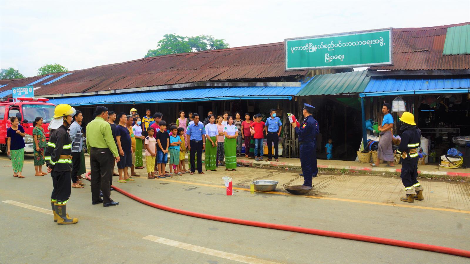 ရှေးဦးစွာ ခရိုင်မီးသတ်ဦးစီးဌာန ခရိုင်ဦးစီးမှူး ဦးသိန်းထိုက်နှင့် မြို့နယ်ဦးစီးမှူး ဦးတိတုတို့က အရေးပေါ်မီးလောင်မှုအခြေအနေ တွင် မီးသတ်ဆေးဘူးအသုံးပြု၍ မီးငြှိမ်းသတ်နိုင်ရေးအတွက် မီးသတ်ဆေးဘူးအသုံး ပြုပုံအဆင့်ဆင့်တို့ကို လက်တွေ့ရှင်းလင်း အသိပညာပေးပြသခဲ့ကြပြီး မီးဘေးဇာတ် တိုက်လေ့ကျင့်ရာသို့ တက်ရောက်လာသည့် ဌာနဆိုင်ရာများ၊ ဈေးသူဈေးသားများက တစ်ဦးချင်း လက်တွေ့မီးငြှိမ်းသတ်သရုပ်ပြသခဲ့ကြသည်။