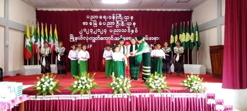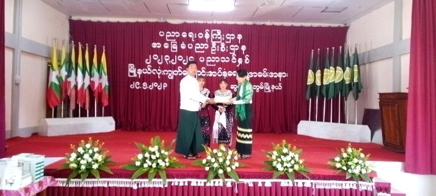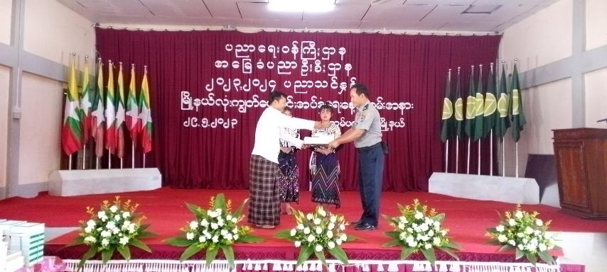 ဆက်လက်၍ မြို့နယ်စီမံအုပ်ချုပ်ရေးအဖွဲ့ဥက္ကဋ္ဌနှင့် အဖွဲ့ဝင်များ၊ မြို့နယ်ဌာနဆိုင်ရာများ၊ မြို့နယ်ရဲတပ်ဖွဲ့ဝင်များက နိုင်ငံတော်မှထောက်ပံ့သည့် ပုံနှိပ်စာအုပ်များ၊ ဗလာစာအုပ်နှင့်အခြားစာရေးကိရိယာများကို ထောက်ပံ့ပေးအပ်ရာ မြို့နယ်ပညာရေးမှူး ဒေါ်သီတာဌေးနှင့်တာဝန်ရှိသူများက အသီးသီးလက်ခံခဲ့ကြသည်။