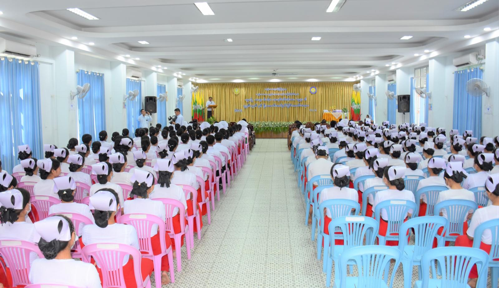 ထို့နောက် သူနာပြုသင်တန်းကျောင်းအုပ် ဒေါ်ဆမီထခေါန်ဆားရ်က သူနာပြုသင်တန်းကျောင်းမှ ဂျူတီကုတ်နှင့် ဦးဆောင်းအပ်နှင်းခြင်းဆိုင်ရာများ၊ သင်တန်းကျောင်း၏ သင်ကြားရေး လုပ်ငန်းများ ဆောင်ရွက်မှု အခြေအနေကို အကျဉ်းချုပ် ရှင်းလင်းတင်ပြပြီး ကျောင်းအုပ်ကြီးနှင့် သင်တန်းကျောင်း စီမံခန့်ခွဲရေးနှင့် ပညာရေးအဖွဲ့ဝင်များက သူနာပြု-သားဖွားသင်တန်းကျောင်းတို့မှ ပထမနှစ် သူနာပြု သင်တန်းသား (၃)ဦးနှင့် သင်တန်းသူ (၄၃)ဦးတို့အား ဂျူတီကုတ်နှင့် ဦးဆောင်း အပ်နှင်းပေးခဲ့ကြရာ ဂျူတီကုတ်နှင့် ဦးဆောင်းအပ်နှင်းခြင်းခံရသော သင်တန်းသား/သင်တန်းသူများက သူနာပြုသစ္စာ အဓိဌာန်ရွတ်ဆိုခြင်းနှင့် ဂရုဏာအလင်း သီချင်းကို ဂုဏ်ယူစွာဖြင့် သီဆိုခဲ့ကြသည်။