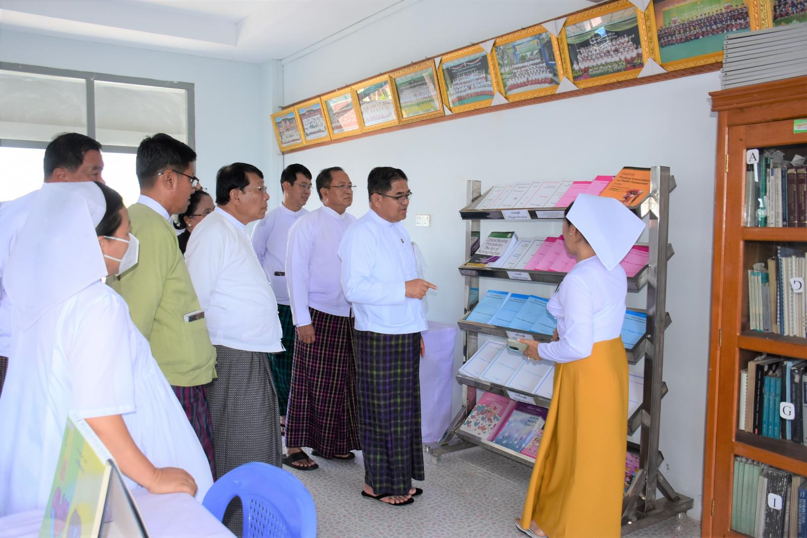 ဆက်လက်၍ ပြည်နယ်ဝန်ကြီးချုပ်၊ ပြည်နယ်တရားလွှတ်တော် တရားသူကြီးချုပ်၊ ပြည်နယ်ဝန်ကြီးများနှင့် ဌာနဆိုင်ရာတာဝန်ရှိသူများက သူနာပြုသင်တန်းကျောင်းရှိ စာကြည့်တိုက်၊ သင်ကြားရေး သရုပ်ပြပစ္စည်းများပြခန်းနှင့် ကွန်ပျူတာသင်တန်းခန်းမတို့ကို လှည့်လည်ကြည့်ရှုစစ်ဆေးခဲ့ကြသည်။