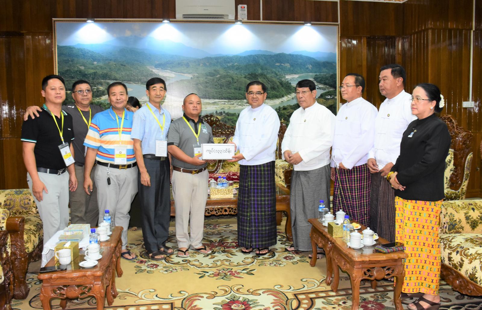 ထို့နောက် ပြည်နယ်ဝန်ကြီးချုပ်သည် ပြည်နယ်အစိုးရအဖွဲ့ရုံး ဧည့်ခန်းမ၌ “မိုခါ” ဆိုင်ကလုန်း မုန်တိုင်းဘေးသင့်ဒေသများအတွက် ကူညီထောက်ပံ့နိုင်ရေး အလှူငွေပေးအပ်လှူဒါန်းမှုကို ကျင်းပပြု လုပ်ခဲ့ပြီး ပြည်နယ်ဝန်ကြီးချုပ်က ဆိုင်ကလုန်းမုန်တိုင်း“မိုခါ”ဖြတ်သန်းဝင်ရောက်မှုကြောင့်ဘေးသင့် ဒေသများအတွက် နိုင်ငံတော်အစိုးရမှ ဦးဆောင်၍ ပြန်လည်ထူထောင်ရေးနှင့် ကူညီကယ်ဆယ်ရေး လုပ်ငန်းများ ဆောင်ရွက်နေမှု အခြေအနေများနှင့် ကချင်ပြည်နယ်မှလည်း ပူးပေါင်းပါဝင်ကူညီလျက် ရှိသည့်အခြေအနေများကို ရှင်းလင်းပြောကြားကာ ဘေးသင့်ဒေသများအတွက် MBGA ဂေါက်ရိုက် အသင်းမှ အလှူငွေကျပ် (၁၃၃) သိန်း လှူဒါန်းမှုအား လက်ခံရယူပြီး ဂုဏ်ပြုမှတ်တမ်းလွှာကို ပြန်လည်ပေးအပ်ခဲ့သည်။