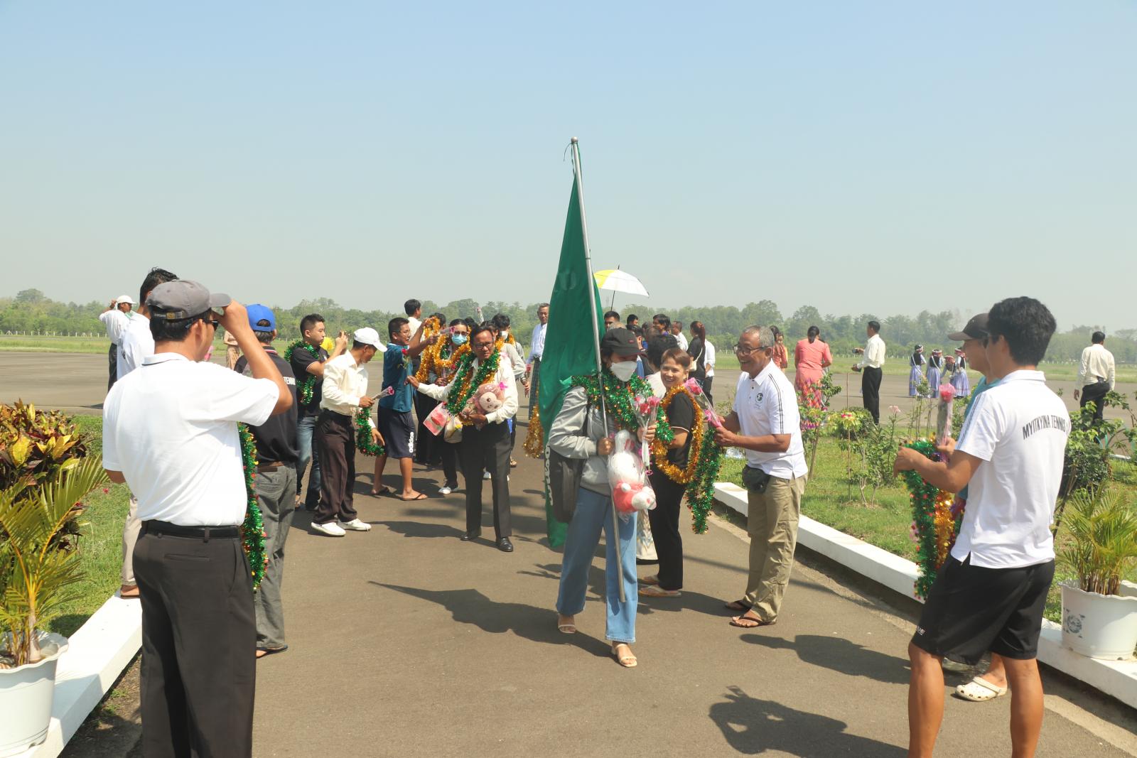 ထို့သို့ ဂုဏ်ပြုကြိုဆိုရာတွင် ပြည်နယ်အစိုးရအဖွဲ့ဝင် လူမှုရေးရာဝန်ကြီး ဦးဝင်းရဲထွန်း၊ ပြည်နယ် အားကစားနှင့်ကာယပညာဦးစီးဌာနမှ ပြည်နယ်ဦးစီးမှူးနှင့် အရာထမ်း/အမှုထမ်းများက အေရိုးဗစ် အကအဖွဲ့များနှင့် အတူ လေဆိပ်၌ နွေးထွေးစွာ ဂုဏ်ပြုကြိုဆိုခဲ့ကြပြီး လေဆိပ်ဧည့်ခန်းမဆောင်၌ ပြည်နယ်လက်ရွေးစင်အသင်း အုပ်ချုပ်သူများက ပြိုင်ပွဲဝင်ရောက်ယှဉ်ပြိုင်ခဲ့မှု အခြေအနေများနှင့် စပ်လျဉ်း၍ ရှင်းလင်းတင်ပြရာ ပြည်နယ်ဝန်ကြီးက ဂုဏ်ပြုအားပေးစကားပြောကြားခဲ့သည်။