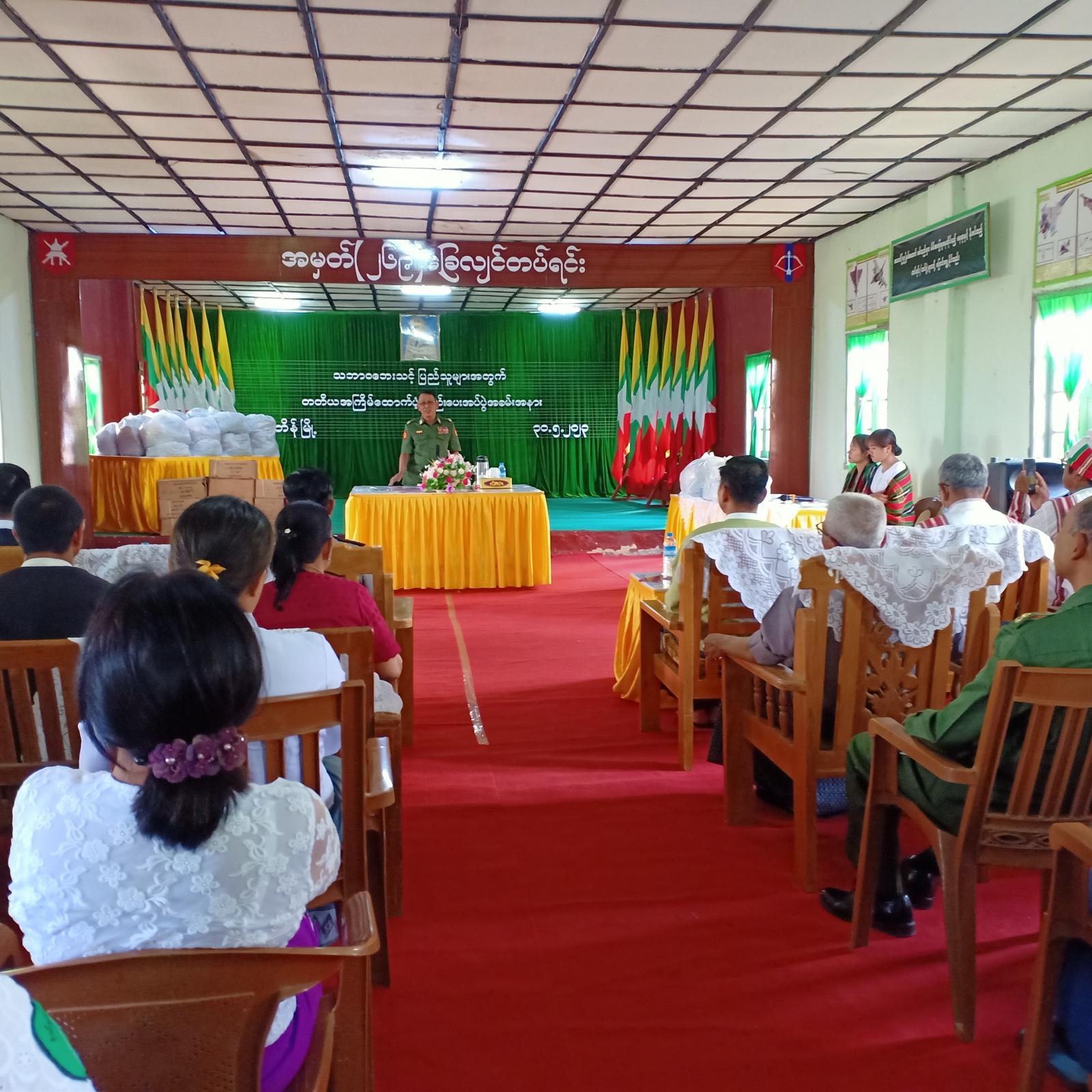 ချင်းပြည်နယ်၊ တီးတိန်မြို့၌ တီးတိန်ခရိုင် သဘာဝဘေး ပြန်လည်ထူထောင်ရေး တာဝန်ခံ ဗိုလ်မှူးချုပ် ဝင်းကိုကိုနှင့် တာဝန်ရှိသူများ တက်ရောက်ပြီး အမှတ် (၂၆၉) ခြေလျင်တပ်ရင်းခန်းမ တွင် မေ ၃၀ ရက် မွန်းလွဲ ၂ နာရီက တီးတိန်မြို့ သဘာဝဘေးသင့်ပြည်သူများအား တတတိယအကြိမ် ထောက်ပံ့ပစ္စည်း ပေးအပ်ပွဲပြုလုပ်သည်။