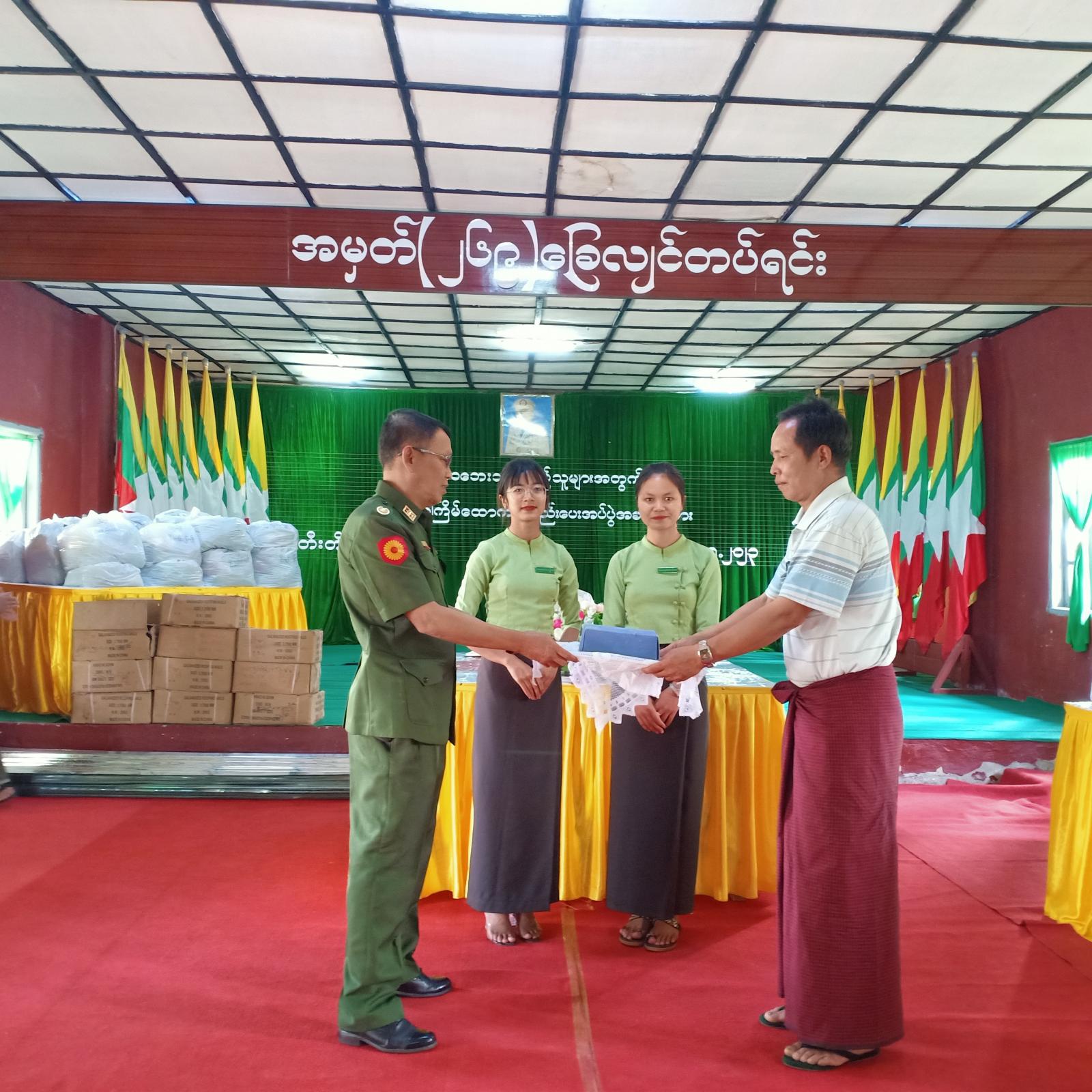 ဦးစွာ ဗိုလ်မှူးချုပ် ဝင်းကိုကိုက အမှာစကားပြောကြားပြီး မုန်တိုင်းဒဏ်သင့်ပြည်သူများအား ထောက်ပံ့ပစ္စည်းများ လက်ဝယ်ပေးအပ်ပြီး သဘာဝဘေးသင့်ပြည်သူများ ကိုယ်စားပြည်သူ တစ်ဦးက ကျေးဇူးတင်စကား ပြန်လည်ပြောကြားသည်။