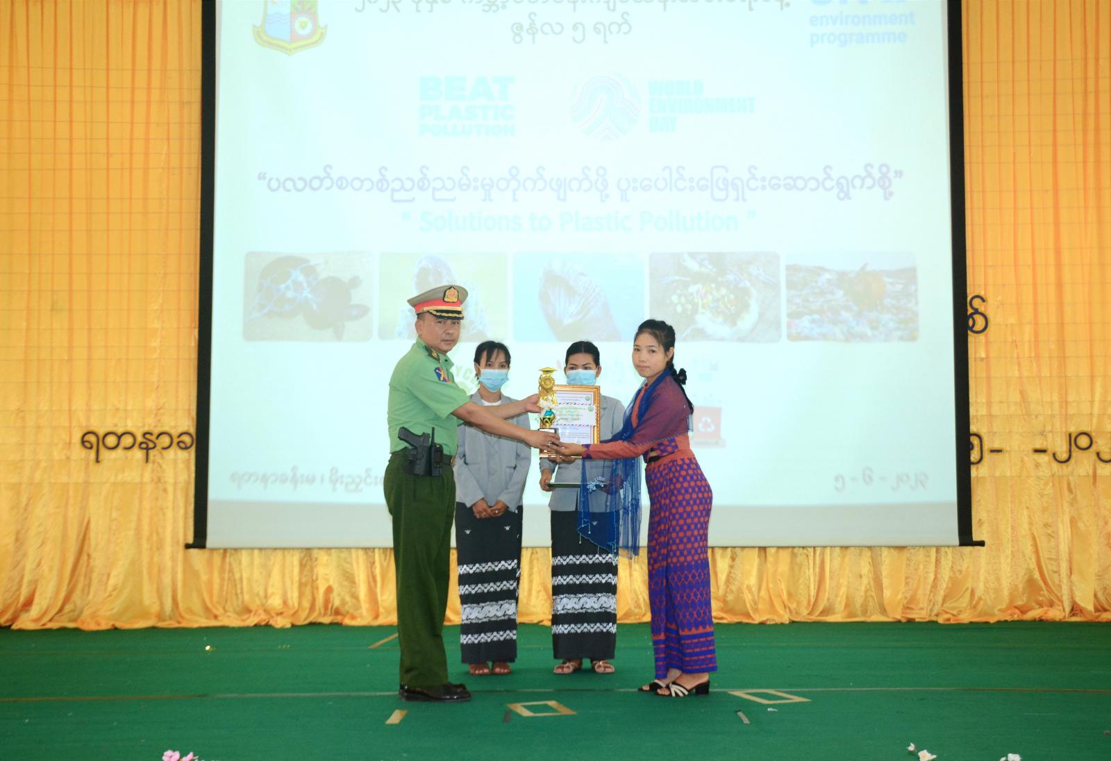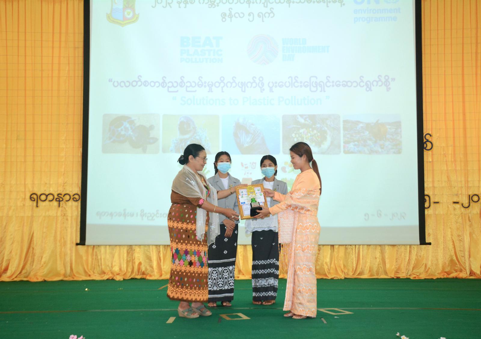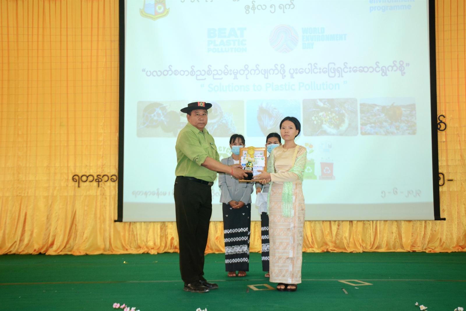 ယင်းနောက် ဇွန်လ (၃) ရက်တွင် ကျင်းပခဲ့သည့် “ပလပ်စတစ်ညစ်ညမ်းမှု တိုက်ဖျက်ဖို့ ပူးပေါင်းဖြေရှင်းဆောင်ရွက်စို့” ဟူသောခေါင်းစဉ်ဖြင့် မြန်မာဘာသာနှင့်အင်္ဂလိပ်ဘာသာ စာစီစာကုံးပြိုင်ပွဲများတွင် ပါဝင်ယှဉ်ပြိုင်ခဲ့ကြသော ကျောင်းသားကျောင်းသူများမှ ဆုရရှိကြသူများကို တာဝန်ရှိသူများက ဆုများအသီးသီးချီးမြှင့်ပေးအပ်ခဲ့ကြသည်။