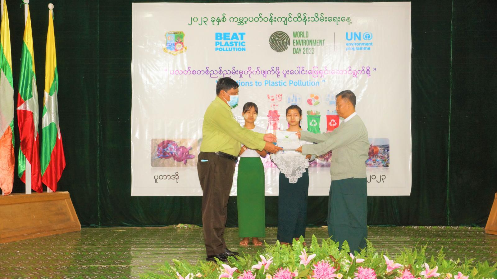 ဆက်လက်၍ အခမ်းအနားတက်ရောက်လာသည့် ခရိုင်/မြို့နယ် ဌာနဆိုင်ရာများ၊ ကျောင်းဆရာ ဆရာမများနှင့် ကျောင်းသား၊ ကျောင်းသူများက ကမ္ဘာ့ ပတ်ဝန်းကျင်ထိန်းသိမ်းရေးနေ့ အထိမ်းအမှတ် ဗီဒီယိုမှတ်တမ်းကို ကြည့်ရှုအားပေးခဲ့ကြပြီး ဒုတိယခရိုင်အုပ်ချုပ်ရေးမှူး၊ ခရိုင်ပညာရေးမှူး ဒေါ်သန်းသန်းညွှန့်၊ မြို့နယ်ပညာရေးမှူး ဦးဝင်းဆွေ၊ မြို့နယ်စီမံအုပ်ချုပ်ရေးအဖွဲ့ဉက္ကဋ္ဌ ဦးကျော်ကျော်လွင်တို့က ၂၀၂၃ ခုနှစ်၊ ကမ္ဘာ့ပတ်ဝန်းကျင် ထိန်းသိမ်းရေးနေ့ အထိမ်းအမှတ်အနေဖြင့် ကျင်းပခဲ့သော အထက်တန်းအဆင့် စာစီစာကုံးပြိုင်ပွဲ၊ အလယ်တန်းအဆင့် ပန်းချီပြိုင်ပွဲ၊ မူလတန်းအဆင့် ပန်းချီပြိုင်ပွဲတွင် ပထမ၊ ဒုတိယ၊ တတိယ၊ အထူးဆုနှင့် နှစ်သိမ့်ဆုရရှိသည့် ကျောင်းသား၊ ကျောင်းသူများအား ဂုဏ်ပြုဆုငွေ ဂုဏ်ပြုမှတ်တမ်းလွှာနှင့် ၂၀၂၃ ခုနှစ် ကမ္ဘာ့ ပတ်ဝန်းကျင်ထိန်းသိမ်းရေးနေ့ အထိမ်းအမှတ်အခမ်းအနားတွင် ပူးပေါင်းဆောင်ရွက်ခဲ့ကြသူများအား ဂုဏ်ပြုမှတ်တမ်းလွှာများ ပေးအပ်ချီမြှင့်ခဲ့ကြသည်။