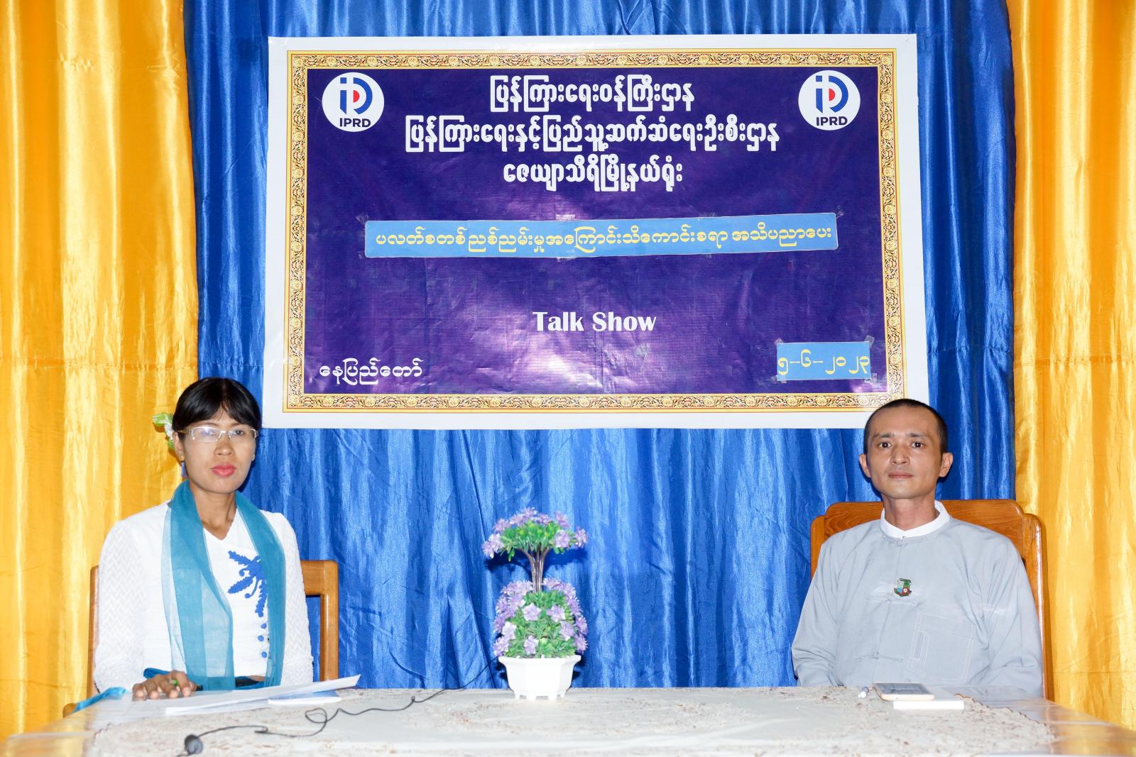 ပြည်ထောင်စုနယ်မြေ၊ နေပြည်တော်၊ ဇေယျာသီရိမြို့နယ် ပြန်ကြားရေးနှင့်ပြည်သူ့ဆက်ဆံရေးဦးစီးဌာနရုံး လူထုအခြေပြုဗဟိုဌာန (Community Centre) ခန်းမတွင် ပလတ်စတစ် ညစ်ညမ်းမှုများအကြောင်းကို ပြည်သူများ ကျယ်ပြန့်စွာသိရှိစေရန်အတွက် အသိပညာပေး Talk Show ကို ယနေ့မွန်းလွဲပိုင်းက ရိုက်ကူးထုတ်လွှင့်ခဲ့သည်။