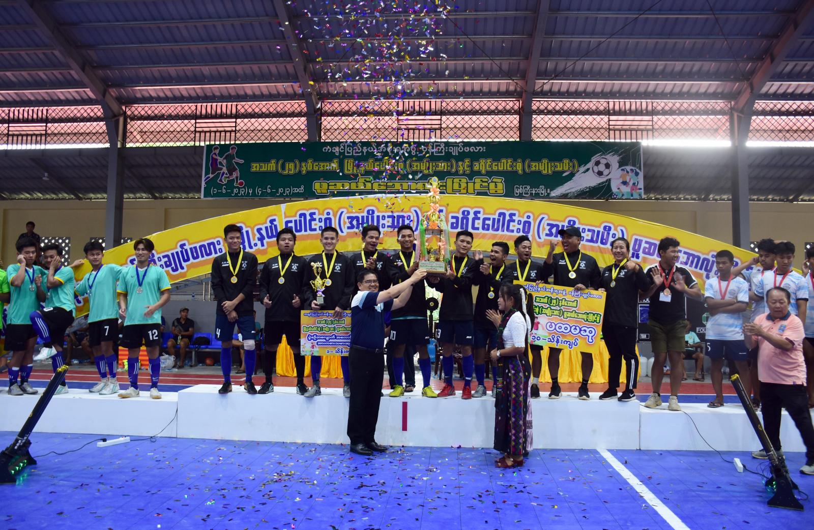 ယင်းနောက် မြို့နယ်ပေါင်းစုံအမျိုးသားဘောလုံးပြိုင်ပွဲ ဆုရအသင်းများအား ဆုများပေးအပ် ချီးမြှင့်ရာ ပြည်နယ်လမ်းပန်းဆက်သွယ်ရေးဝန်ကြီးက နေရာအလိုက် အကောင်းဆုံးအားကစားသမားဆုများကိုလည်းကောင်း၊ ပြည်နယ်သယံဇာတရေးရာဝန်ကြီးက တတိယဆုရ မြစ်ကြီးနားမြို့နယ် အသင်းအားလည်းကောင်း၊ ပြည်နယ်စီးပွားရေးရာဝန်ကြီးက ဒုတိယဆုရပူတာအိုမြို့နယ်အသင်းအားလည်းကောင်း၊ ပြည်နယ်တရားလွှတ်တော်တရားသူကြီးချုပ်က ပထမဆုရဖားကန့်မြို့နယ် အသင်းအားလည်းကောင်း တစ်ဦးချင်းလည်ဆွဲဆုတံဆိပ်နှင့် ဂုဏ်ပြုဆုငွေများကို အသီးသီးပေးအပ် ချီးမြှင့်ပေးအပ်ခဲ့ကြပြီး ပြည်နယ်ဝန်ကြီးချုပ်က ပထမဆုရအသင်းအတွက် တံခွန်စိုက်ဒိုင်းဆုကို ပေးအပ်ချီးမြှင့်ခဲ့ကြောင်း သိရှိရသည်။