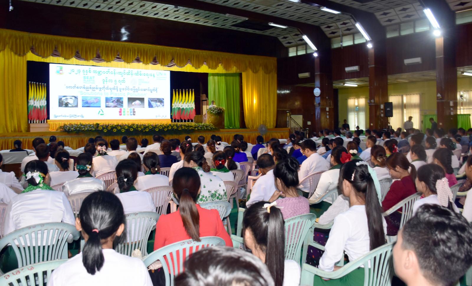 အခမ်းအနားတွင် ပြည်နယ်ဝန်ကြီးချုပ် ဦးခက်ထိန်နန်က ယနေ့ကာလတွင် ကမ္ဘာလုံးဆိုင်ရာ ပြဿနာတစ်ရပ်ဖြစ်လာသည့် ပလတ်စတစ်ညစ်ညမ်းမှု တိုက်ဖျက်ရေးအတွက် ကဏ္ဍစုံမှ ပေါင်းစပ် ပြီး အစီအမံများ ချမှတ်အကောင် အထည်ဖော်လိုက်နာဆောင်ရွက်စေလိုပါကြောင်း၊ မဖြစ်မနေအသုံး ပြုရန် လိုအပ်သည့်နေရာများတွင်သာ ပလတ်စတစ်ထုတ်ပိုးမှုနှင့် အသုံးအဆောင်များကို သုံးစွဲ၍လျှော့သုံးပါ (Reduce)၊ ပြန်သုံးပါ (Reuse)၊ ပြန်ထွင်သုံးပါ (Recycle) ဆိုသည့် “3 R” နည်းလမ်းအပြင် မလိုအပ်ဘဲ ပလတ်စတစ်ထုတ်ပိုးမှုများကို ငြင်းပယ်ခြင်းအလေ့အကျင့်ကိုလည်း အားလုံးကလိုက်နာ ဆောင်ရွက်သွားကြမည်ဆိုပါက မိမိတို့အတွက်၊ ပြည်နယ်အတွက်သာမက နိုင်ငံအတွက်အကျိုးများ စွာဖြစ်ထွန်းစေမည်ဖြစ်ပါကြောင်း တိုက်တွန်းမှာ ကြားသည်။