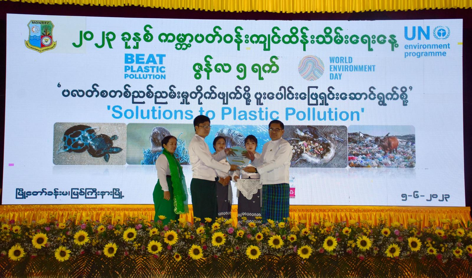“ပလတ်စတစ်ညစ်ညမ်းမှုတိုက်ဖျက်ဖို့ ပူးပေါင်းဖြေရှင်းဆောင်ရွက်စို့” ဆောင်ပုဒ်ဖြင့် ၂၀၂၃ ခုနှစ် ကမ္ဘာ့ပတ်ဝန်းကျင်ထိန်းသိမ်းရေးနေ့ အထိမ်းအမှတ်အခမ်းအနားကို ဇွန် ၅ ရက် နံနက် ၉ နာရီ က မြစ်ကြီးနားမြို့ မြို့တော်ခန်းမ၌ကျင်းပပြုလုပ်ခဲ့ကြပြီး ပြည်နယ်အဆင့်သန့်ရှင်း၍ စိမ်းလန်းစိုပြေသောကျောင်းဆုများ၊ တက္ကသိုလ်အဆင့်ဆောင်းပါးနှင့် စာစီစာကုံးပြိုင်ပွဲ ဆုရရှိသူများကို ဆုများချီးမြှင့်ပေးအပ်ခဲ့ကြသည်။