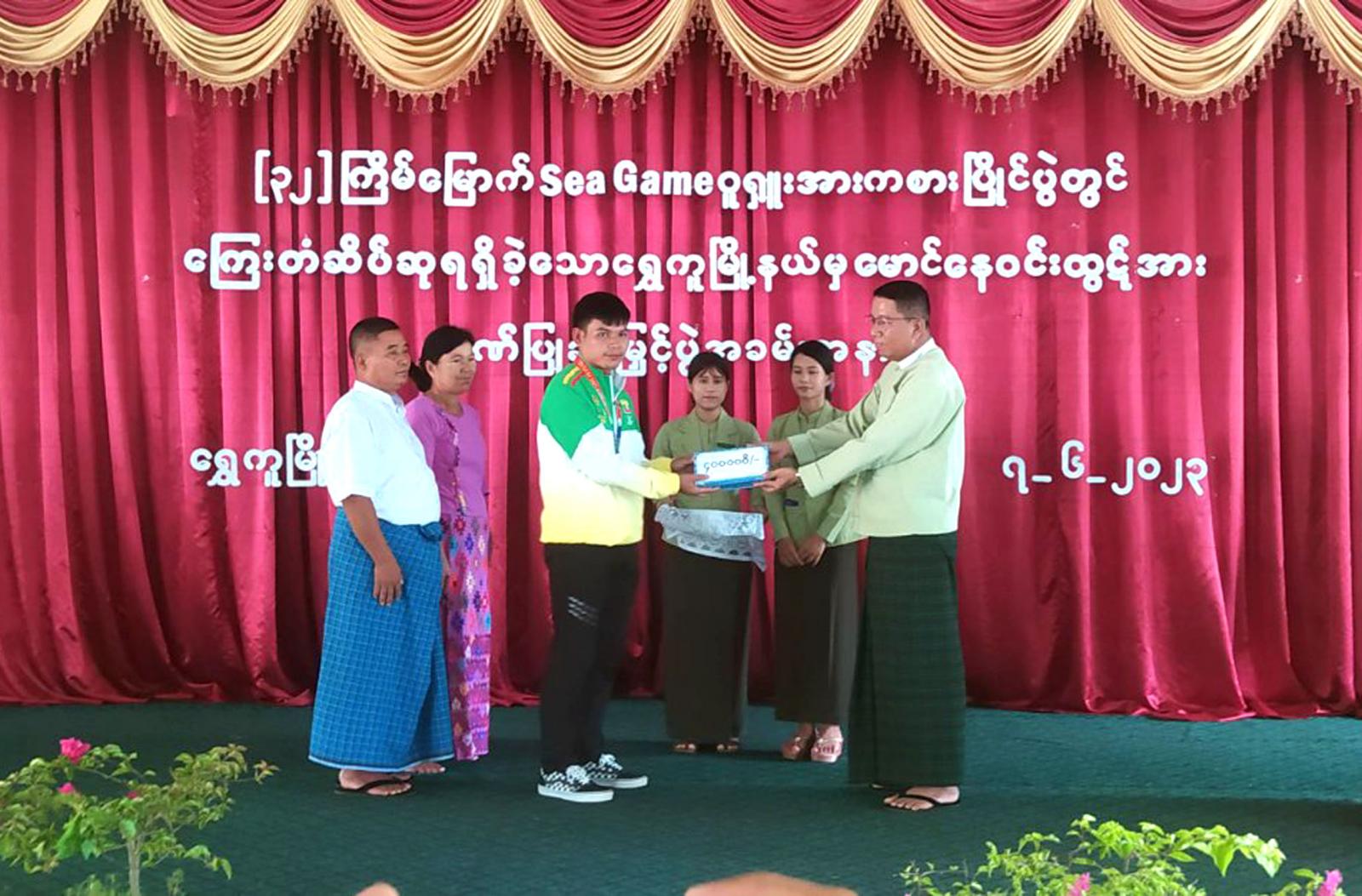 (၃၂)ကြိမ်မြောက် အရှေ့တောင်အာရှ ဆီးဂိမ်းပြိုင်ပွဲ၌ မြန်မာနိုင်ငံကိုယ်စားပြု ဝူရှူးအားကစား ပြိုင်ပွဲတွင် တတိယဆုရရှိခဲ့သော ကချင်ပြည်နယ်၊ ဗန်းမော်ခရိုင်၊ ရွှေကူမြို့နယ် ဂုဏ်ဆောင် အားကစားသမား မောင်နေဝင်းထွဋ်အား ကြိုဆိုဂုဏ်ပြုပွဲကို ယနေ့ နံနက် ၁၁ နာရီခွဲခန့်က မြို့တော်ခန်းမ၌ ဂုဏ်ပြုချီးမြှင့်ခဲ့ကြောင်း သိရသည်။