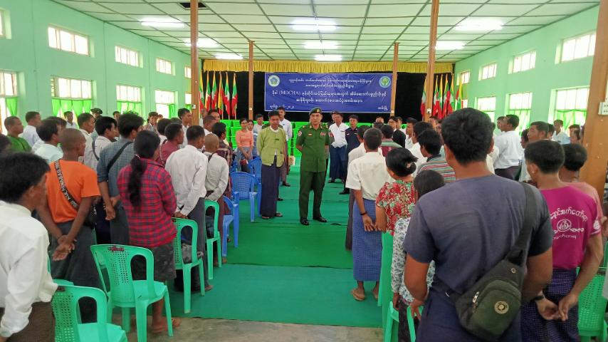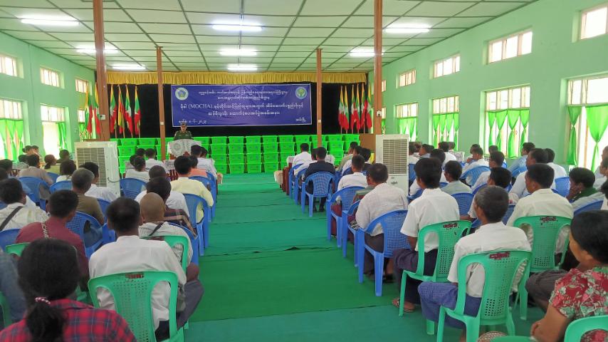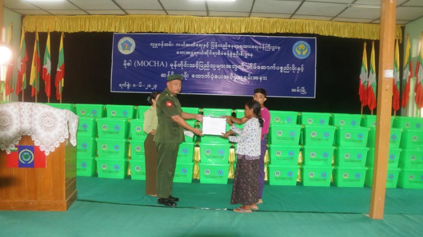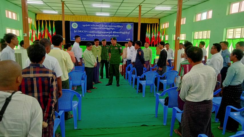 (မိုခါ)မုန်တိုင်းသင့်ပြည်သူများအတွက် အိမ်ဆောက်ပစ္စည်းဖိုးနှင့် ဆန်ရိက္ခာဖိုး ထောက်ပံ့ငွေပေးအပ်ပွဲသို့ အနောက်ပိုင်းတိုင်းစစ်ဌာနချုပ်မှ ဒုတိယတိုင်းမှူး ဗိုလ်မှူးချုပ် အောင်ကျော်မင်းနှင့် ခရိုင်/မြို့နယ်သဘာဝဘေး အန္တရာယ်ဆိုင်ရာ စီမံခန့်ခွဲမှုကော်မတီဝင်များ၊ ဌာနဆိုင်ရာတာဝန်ရှိသူများ၊ ရပ်ကွက်/ကျေးရွာ အုပ်ချုပ်ရေးမှူးများနှင့် လေဘေးသင့်ပြည်သူများ တက်ရောက်ခဲ့ကြကြောင်းသိရသည်။