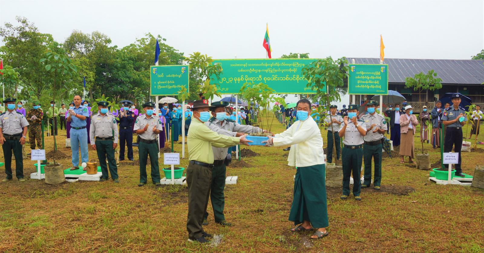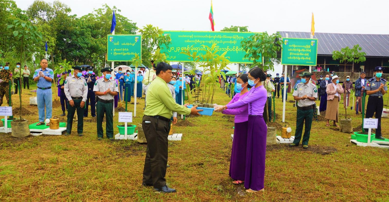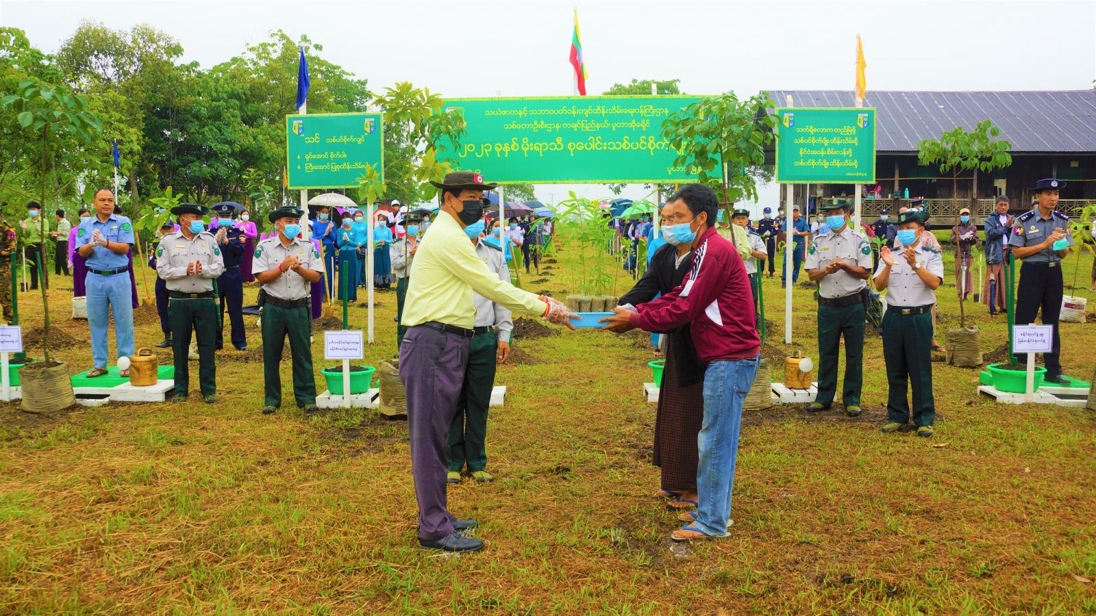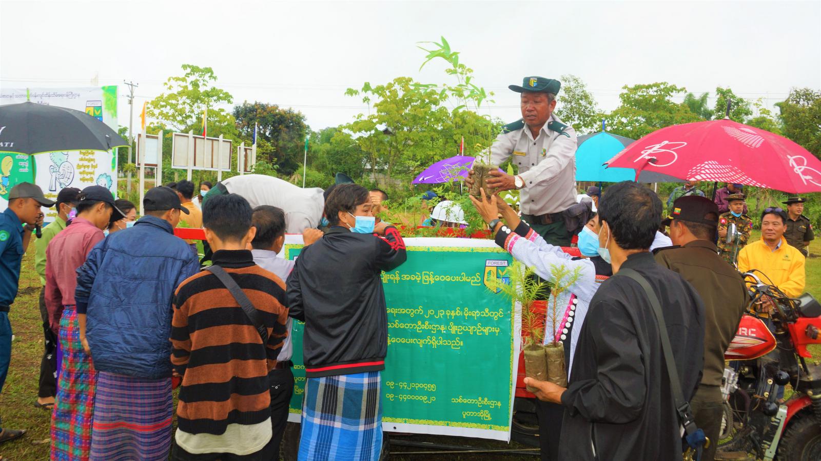 ရှေးဦးစွာ ခရိုင်စီမံအုပ်ချုပ်ရေးအဖွဲ့ ဉက္ကဌ ဦးခေါင်လန်ဒီး၊ဒုတိယခရိုင်အုပ်ချုပ်ရေးမှူး ဦးသန်းထွေး၊ ခရိုင်စီမံအုပ်ချုပ်ရေးအဖွဲ့ အတွင်းရေးမှူးဒုတိယရဲမှူးကြီး သိန်းဆွေညွန့် ၊ခရိုင်စီမံကိန်းရေးဆွဲရေးဦးစီးဌာန ခရိုင်ဦးစီးမှူးဦးဝင်းရှိန်၊ ခရိုင်ဖွံ့ဖြိုးမှုကြီးကြပ်ရေးရုံး ဒုတိယညွှန်ကြားရေးမှူး ဦးဇော်ဇော်ထွန်း၊ ခရိုင်ပညာရေးမှူး ဒေါ်သန်းသန်းညွန့်၊ မြို့နယ်စီမံအုပ်ချုပ်ရေးအဖွဲ့ဉက္ကဋ္ဌ ဦးကျော်ကျော်လွင်၊ မြို့နယ်သစ်တောဦးစီးဌာန မြို့နယ်ဦးစီးမှူး ဦးစောဖန်းအောင်တို့က စိုက်ပျိုးမည့်အပင်များကို တာဝန်ရှိသူများထံဖြန့်ဝေပေးအပ်သည်။