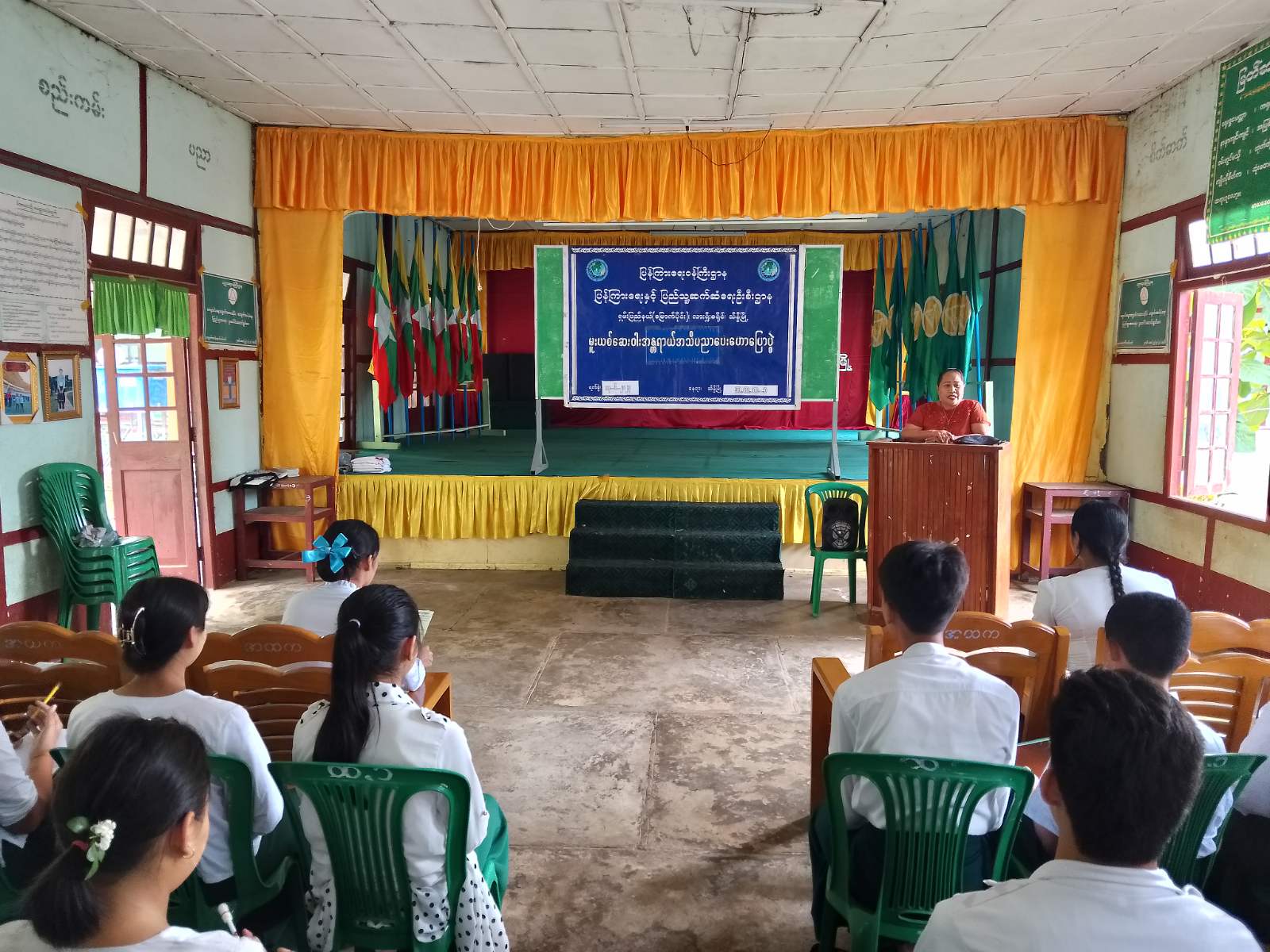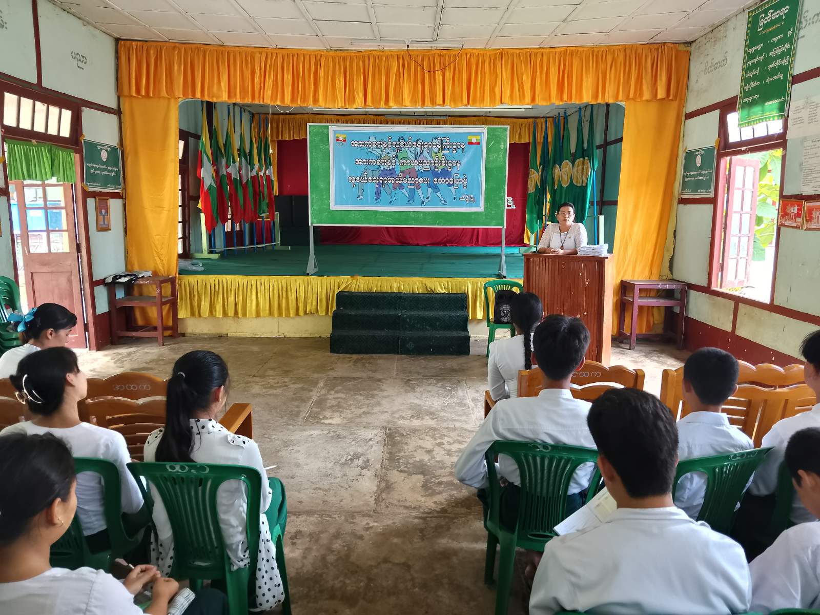 အခမ်းအနားတွင် ရှေးဦးစွာ မြို့နယ်ပညာရေးမှူး ဒေါ်သူဇာအေးက အဖွင့်အမှာစကား ပြောကြားခဲ့သည်။ ထို့နောက် မြို့နယ်ပြန်ကြားရေးနှင့်ပြည်သူ့ဆက်ဆံရေးဦးစီးဌာနမှ ဦးစီးအရာရှိ ဒေါ်အိအိသိမ့်က မူးယစ်ဆေးဝါးနှင့်ပတ်သက်၍ ကျောင်းသားလူငယ်များ သိရှိလိုက်နာသင့်သည့် အချက်များ၊ စတင်သုံးစွဲရခြင်း၏ အကြောင်းအရင်းများ၊ သုံးစွဲပါက ရရှိမည့် ရုပ်ပိုင်းဆိုင်ရာနှင့် စိတ်ပိုင်းဆိုင်ရာ ဆိုးကျိုးများ၊ သတိပြုရှောင်ကြဉ်ရမည့် အချက်များ စသည်တို့ကို အသိပညာပေး ဟောပြောခဲ့သည်။ ဆက်လက်၍ အားကစားနှင့်လူငယ်ရေးရာဝန်ကြီးဌာန၊ အားကစားနှင့်ကာယပညာဦးစီးဌာနမှ ဦးစီးအရာရှိ ဒေါ်ပပဝင်းက လူငယ်ရေးရာအသိပညာပေး အကြောင်းအရာများကို ဟောပြော၍ ကျောင်းသား၊ ကျောင်းသူများအား မေးခွန်းများ ပြန်လည်မေးမြန်းကာ အမှတ်တရလက်ဆောင်များ ချီးမြှင့်ပေးအပ်ခဲ့သည်။