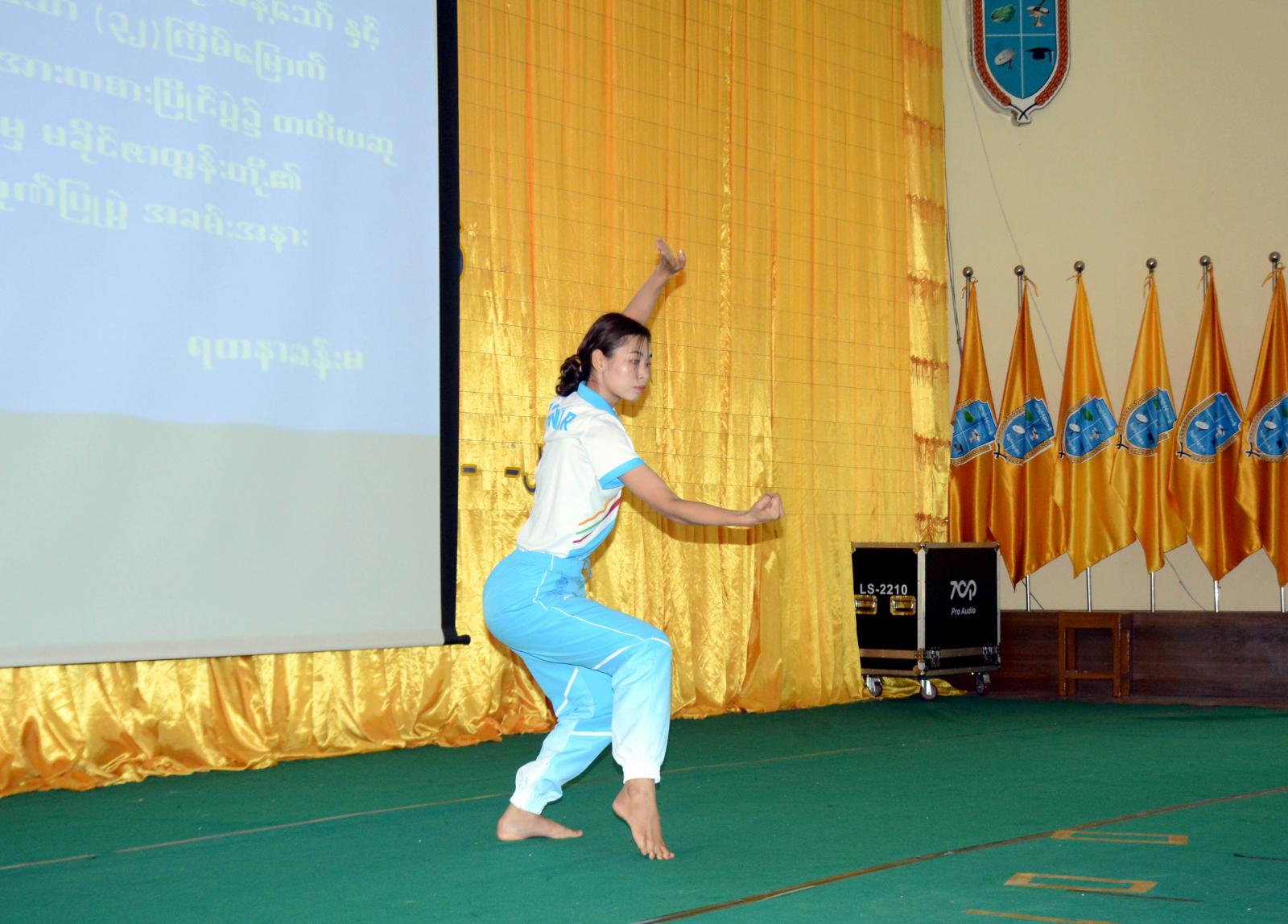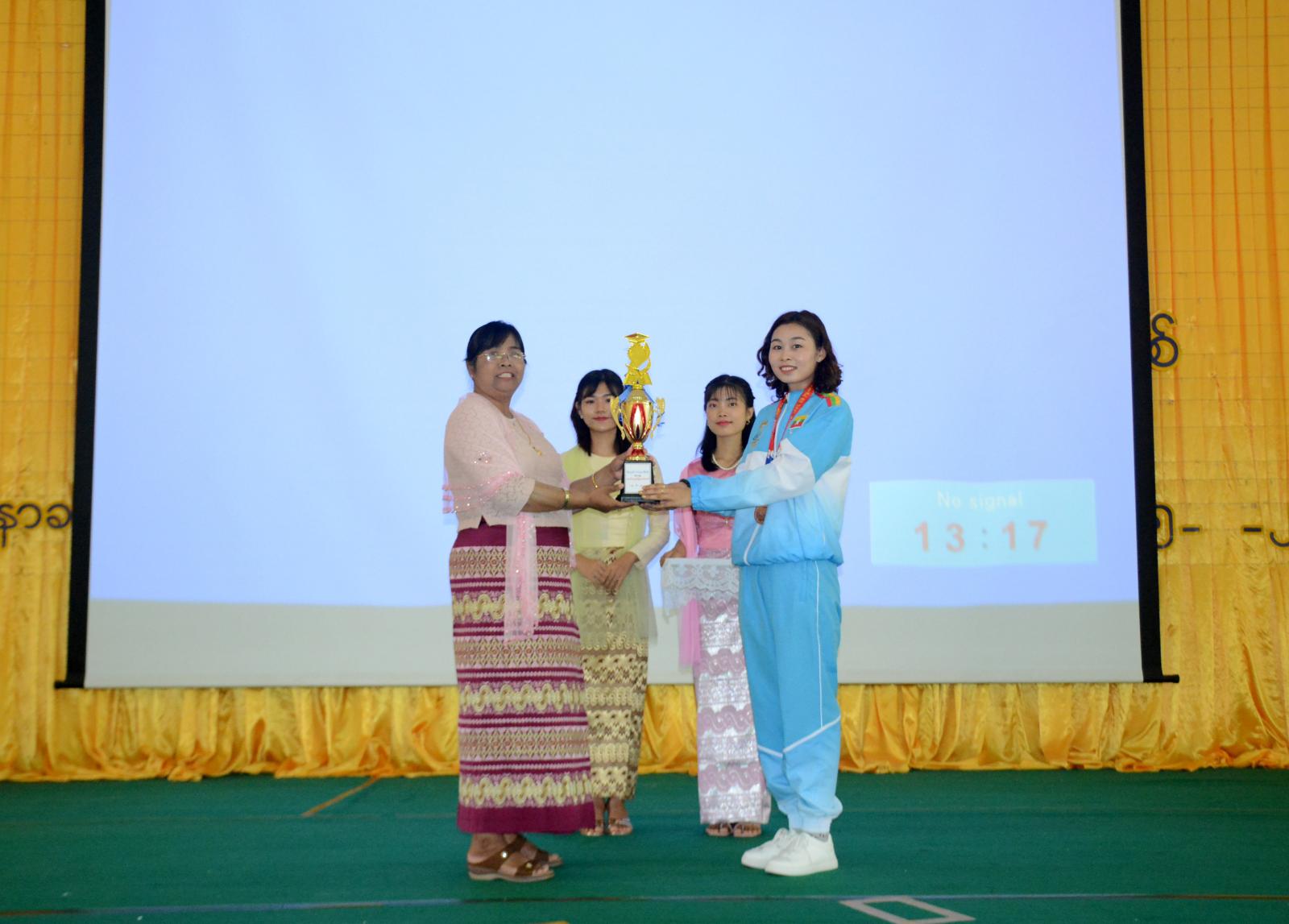 ထို့နောက် တက္ကသိုလ်ပါမောက္ခချုပ် ဒေါက်တာ မဉ္ဇူမင်းနှင့် ဒုတိယပါမောက္ခချူပ် ဒေါက်တာ နိုင်နိုင်လတ်တို့က အဆိုပါ ကျောင်းသားနှင့်ကျောင်းသူ နှစ်ဦးအား ဂုဏ်ပြုဆုနှင့် အမှတ်တရ လက်ဆောင်များ အသီးသီးချီမြှင့်ပေးအပ်ခဲ့ကြကြောင်းနှင့် (၃၂) ကြိမ်မြောက် SEA GAMES ပြိုင်ပွဲတွင် တတိယဆုရရှိခဲ့သော ဗိုဗီနမ် တစ်ကိုယ်တော်ပြ အားကစားအား သရုပ်ပြသခဲ့ကြောင်း သိရသည်။
