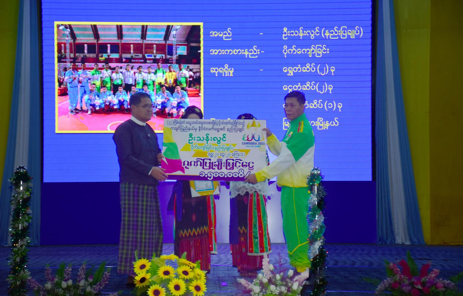 ယင်းနောက် ပြည်နယ်ဝန်ကြီးချုပ်က ပိုက်ကျော်ခြင်းအားကစားနည်းတွင် ရွှေတံဆိပ်(၂)ခု၊ ငွေတံဆိပ်(၂)ခုနှင့် ကြေးတံဆိပ်(၁)ခုရရှိအောင် စွမ်းဆောင်နိုင်ခဲ့သော နည်းပြချုပ် ဦးသန်းလွင်အား ဂုဏ်ပြုချီးမြှင့်ငွေကျပ် (၁၅)သိန်း၊ ငွေတံဆိပ်၊ ကြေးတံဆိပ် (၁)ခုစီရရှိခဲ့သော ပိုက်ကျော်ခြင်း အားကစားသမား မောင်စစ်လင်းထွဋ်အား ဂုဏ်ပြုချီးမြှင့်ငွေကျပ် (၂၃)သိန်း၊ ဝူရှုးအားကစားနည်းတွင် ကြေးတံဆိပ်(၁)ခုရရှိခဲ့သော မောင်နေဝင်းထွဋ်အား ဂုဏ်ပြုချီးမြှင့်ငွေကျပ် (၁၃)သိန်း ကိုလည်း ကောင်း၊ ပြည်နယ်ဝန်ကြီးချုပ်၏ ဇနီးဒေါ်နန်ဆိုင်းက အမျိုးသမီးဘောလုံးပြိုင်ပွဲတွင် ငွေတံဆိပ်ရရှိခဲ့သောမခင်မျိုးဝင်းအား ဂုဏ်ပြုချီးမြှင့်ငွေကျပ် (၁၅)သိန်း၊ ပီတန်းအားကစားနည်းတွင် ပါဝင်ယှဉ်ပြိုင် ခဲ့သော မတင်တင်ဝေအား ဂုဏ်ပြုချီးမြှင့်ငွေကျပ် (၈)သိန်းကိုလည်းကောင်း၊ ပြည်နယ်တရားလွှတ် တော်တရားသူကြီးချုပ် ဦးတူးဂျာကပိုက်ကျော်ခြင်းအားကစားနည်းတွင် ရွှေတံဆိပ်(၂)ခု၊ ငွေတံဆိပ် (၂)ခုနှင့် ကြေးတံဆိပ်(၁)ခုရရှိအောင် စွမ်းဆောင်နိုင်ခဲ့သော နည်းပြများဖြစ်သည့် ဦးကျော် သီဟဦးနှင့် ဦးအောင်ချိုမြင့်တို့အား ဂုဏ်ပြုချီးမြှင့်ငွေကျပ် (၁၅)သိန်းစီနှင့် ဂျူဒိုအားကစားပြိုင်ပွဲတွင် ကြေးတံဆိပ် (၁)ခုရရှိခဲ့သော မောင်ထိုက်ထိုက်ကျော်အား ဂုဏ်ပြုချီးမြှင့်ငွေကျပ် (၁၃)သိန်းကို လည်းကောင်း၊ ပြည်နယ်လူမှုရေးရာဝန်ကြီး ဦးဝင်းရဲထွန်းက တင်းနစ်နည်းပြအဖြစ် ပါဝင်ခဲ့သော ဦးမင်းမင်းအား ဂုဏ်ပြုချီးမြှင့်ငွေကျပ် (၈)သိန်းနှင့် ဝူးရှုး(ထောက်လု)အားကစားပြိုင်ပွဲတွင် ပါဝင် ယှဉ်ပြိုင်ခဲ့သော မောင်ကျော်ဇေဝင်းအား ဂုဏ်ပြုချီးမြှင့်ငွေကျပ် (၈)သိန်းကိုလည်းကောင်း အသီးသီး ဂုဏ်ပြု ချီးမြှင့်ခဲ့ကြရာ ပိုက်ကျော်ခြင်းနည်းပြချုပ်က ကျေးဇူးတင်စကား ပြန်လည် ပြောကြားခဲ့သည်။