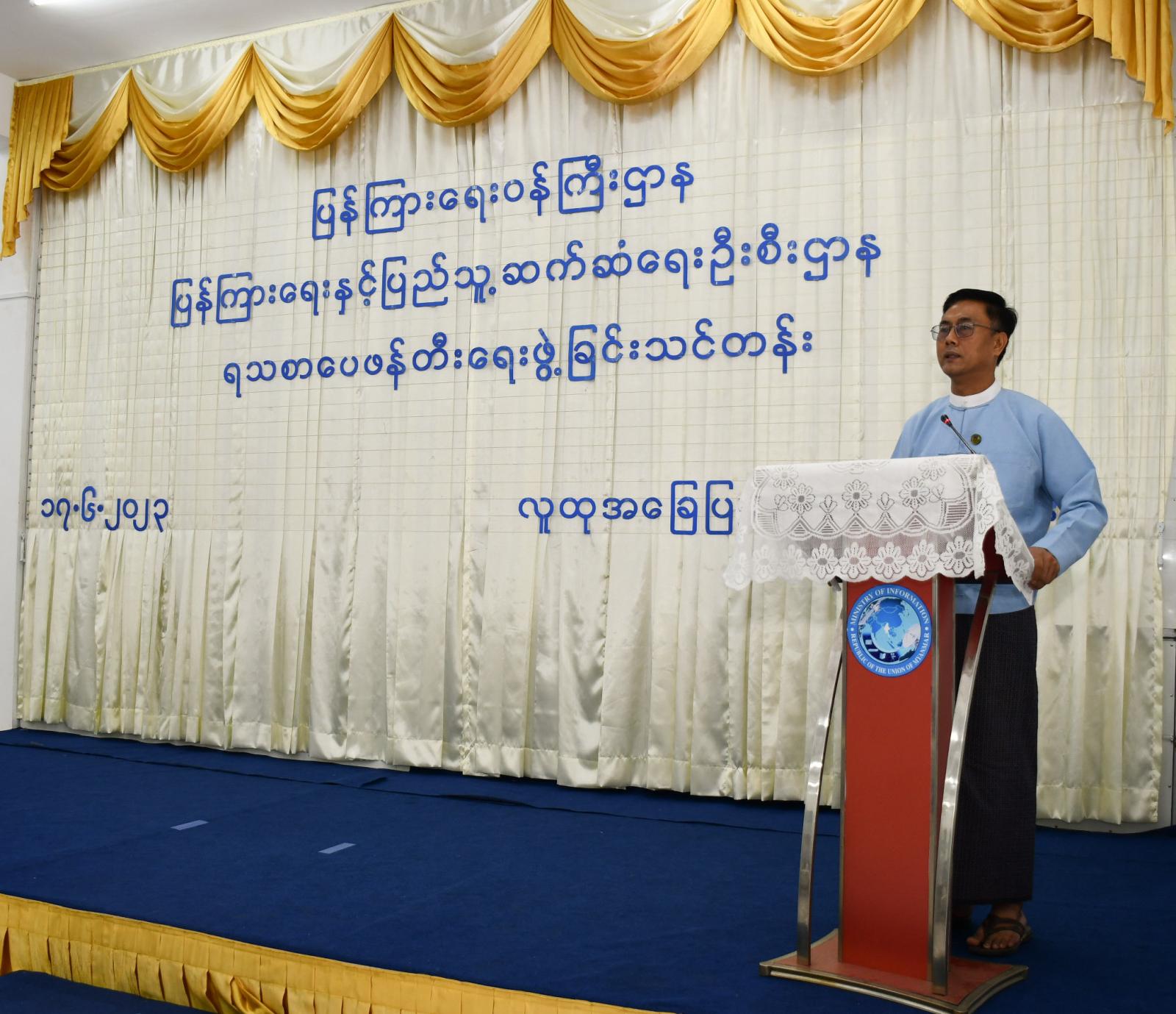 ပြန်ကြားရေးဝန်ကြီးဌာန၊ ပြန်ကြားရေးနှင့်ပြည်သူ့ဆက်ဆံရေးဦးစီးဌာနသည် ဝန်ထမ်းများ လုပ်ငန်းစွမ်းဆောင်ရည်ကောင်းမွန်ပြီး ရသစာပေနှင့်နီးစပ်မှုရှိစေရန်နှင့် စာဖတ် ဝါသနာပါသည့်ဝန်ထမ်းများ ဖြစ်လာစေရေး ပြုစုပျိုးထောင်ပေးရန်ရည်ရွယ်၍ ရသစာပေဖန်တီးရေးဖွဲ့ခြင်းသင်တန်းကို ရန်ကုန်အနောက်ပိုင်းခရိုင်၊ လူထုအခြေပြုဗဟိုဌာန (ဗဟန်း)၊ (Community Centre)၌ ယနေ့နံနက် ၁၀ နာရီတွင် ဖွင့်လှစ်သည်။