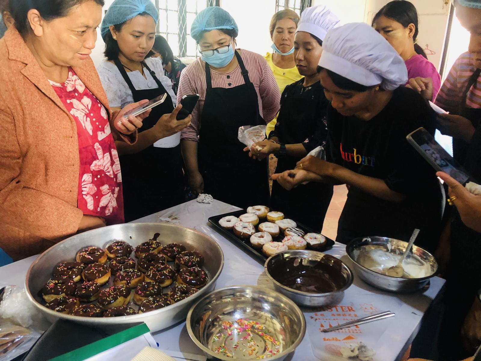တန်ဖိုးမြှင့်စားသောက်ကုန် (Bakery) အမျိုးမျိုး ထုတ်လုပ်မှုနည်းပညာသင်တန်းတွင် လျှာပေါ်ဝဲကွတ်ကီးပြုလုပ်ခြင်း၊ နှမ်းကွတ်ကီးပြုလုပ်ခြင်း၊ ထောပတ်ပလိန်းကိတ်ပြုလုပ်ခြင်း၊ ကော်ဖီကိတ်ပြုလုပ်ခြင်း၊ ကော်ဖီကိတ်ခြောက်ပြုလုပ်ခြင်း၊ ငှက်ပျောကိတ်၊ ကော်ဖီကွက်ကီး၊ ချီဖွန်ကိတ် ပြုလုပ်နည်းနှင့် Donuts ပြုလုပ်နည်းများကို သင်ထောက်ကူပစ္စည်း အစုံအလင်ဖြင့် စာတွေ့လက်တွေ့ သင်ကြားပေးလျက်ရှိကြောင်း သိရသည်။