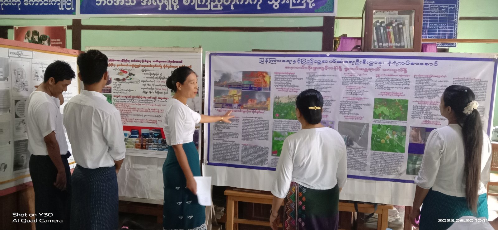 ရှေးဦးစွာ ပြန်ကြားရေးနှင့်ပြည်သူ့ဆက်ဆံရေးဦးစီးဌာန၊ မြို့နယ်ဦးစီးမှူး ဒေါ်ခင်ပပသိန်းက ကျောင်းသားလူငယ်၊ လူရွယ်များအနေဖြင့် မူးယစ်ဆေးဝါး၏ ဆိုးကျိုးများကို ကျယ်ကျယ်ပြန့်ပြန့် သိရှိနားလည်ပြီး မူးယစ်ဆေးဝါးအန္တရာယ်ကို ရှောင်ကြည်နိုင်စေရန် ရည်ရွယ်၍ ယခုကဲ့သို့ အသိပညာပေး လုပ်ငန်းများကို ဆောင်ရွက်ရခြင်းဖြစ်ကြောင်း၊ ပြသထားသည့် နံရံကပ်စာစောင်များ၊ ဓာတ်ပုံပြပွဲများကို လေ့လာခြင်းဖြင့် အသိပညာများ တိုးပွားရရှိစေပြီး ဘယ်သောအခါမှ ဘယ်သူ့ကိုမှ အကျိုးမပေးသော မူးယစ်ဆေးဝါးကို ရှောင်လေဝေးဝေး မူးယစ်ဆေးဆိုသည်နှင့်အညီ ရှောင်ရှားနိုင်ကြရန် ကောင်းမွန်သောစာပေများကို များများ ဖတ်ကြရန်လိုကြောင်း ပြောကြားခဲ့ပြီး မြို့နယ်ပညာရေးမှူး ဒေါ်မြတ်နွယ်က ဇွန်လ(၂၆)ရက်နေ့တွင် ကျရောက်မည့် အပြည်ပြည်ဆိုင်ရာ မူးယစ်ဆေးဝါး အလွဲသုံးမှုနှင့် တရားမဝင်ရောင်းဝယ်မှု တိုက်ဖျက်ရေးနေ့အကြောင်း အသိပညာပေး ဟောပြောခဲ့သည်။