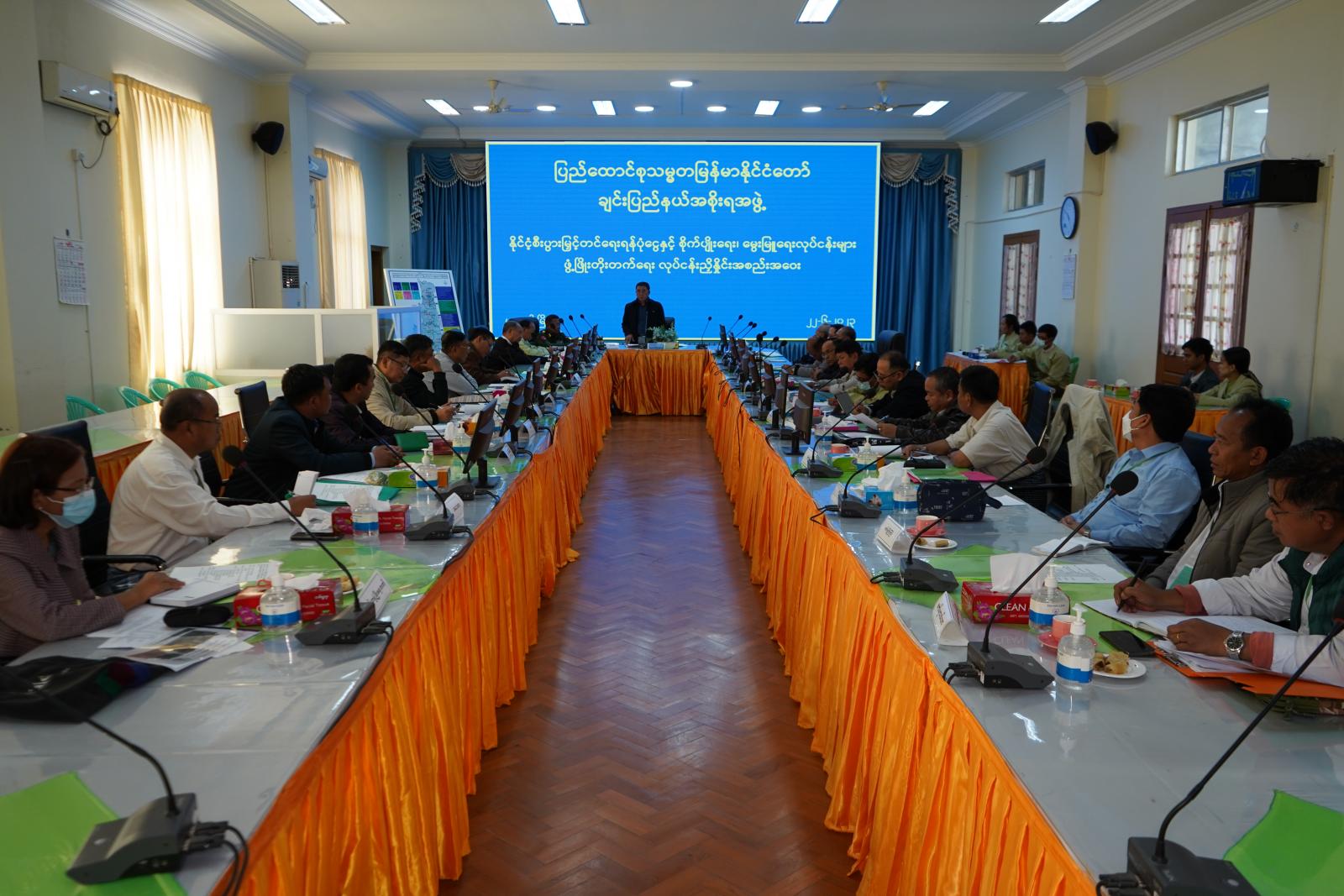 ထို့နောက် ပြည်နယ်မွေးမြူရေးနှင့် ကုသရေးဦးစီးဌာ၊ ပြည်နယ်ငါးလုပ်ငန်းဦးစီးဌာန၊ ပြည်နယ်သမဝါယမဦးစီးဌာန၊ ပြည်နယ်သမဝါယမဦးစီးဌာန၊ ပြည်နယ် ကျေးလက်ဒေသ ဖွံ့ဖြိုးတိုးတက်ရေးဦးစီးဌာန၊ ပြည်နယ်လယ်ယာမြေစီမံခန့်ခွဲရေးနှင့်စာရင်းအင်းဦးစီးဌာန၊ ကုန်းမြင့်လယ်ယာဦးစီးဌာနနှင့် ပြည်နယ် စိုက်ပျိုးရေးဦးစီးဌာနတို့မှ ပြည်နယ်ဦးစီးမှူးများက မိမိတို့ဌာနအလိုက် ဆောင်ရွက်ပြီး ဆောင်ရွက်ဆဲနှင့် နိုင်ငံ့စီးပွားမြှင့်တင်ရေးရန်ပုံငွေဖြင့် ဆောင်ရွက်နေမှု အခြေအနေများကို Power Point ဖြင့် ရှင်းလင်းတင်ပြကြသည်။