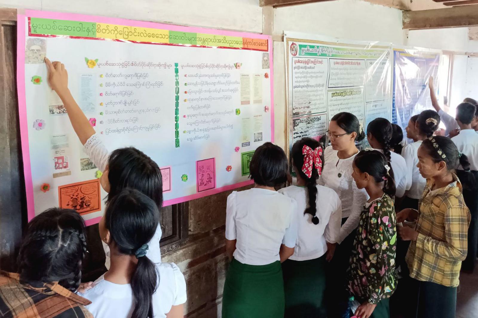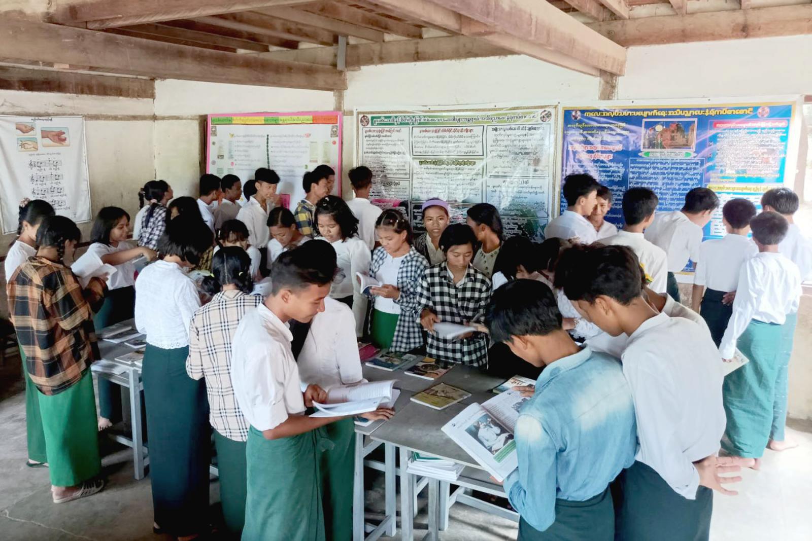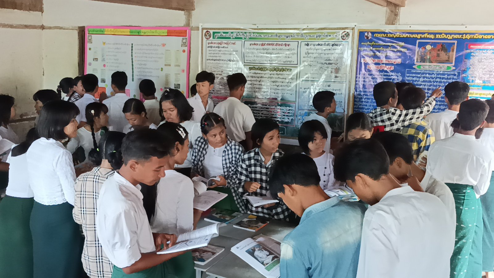 ထို့နောက် မြို့နယ်ပြန်ကြားရေးနှင့်ပြည်သူ့ဆက်ဆံရေးဦးစီးဌာနက ခင်ကျင်းပြသထားသော သုတ၊ ရသ စာအုပ်စာစောင်များ၊ မူးယစ်ဆေးဝါးအန္တရာယ် အသိပညာပေးနံရံကပ်စာစောင်များကို ကျောင်းသားကျောင်းသူလေးများက လေ့လာကြည့်ရှုကြရာ မြို့နယ်ဦးစီးအရာရှိနှင့် ဝန်ထမ်းများက လိုက်လံရှင်းလင်းပြသခဲ့သည်။