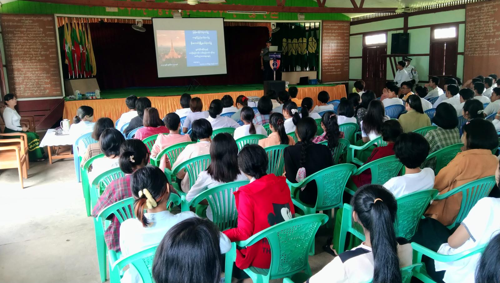 ကျောင်းသား၊ ကျောင်းသူများ လမ်းသွားလမ်းလာ စနစ်တကျစည်းကမ်းရှိစွာ သွားလာတတ်စေရန်ရည်ရွယ်၍ မိုးကောင်းမြို့နယ်ရဲတပ်ဖွဲ့မှ အခြေခံပညာအထက်တန်းကျောင်းများတွင် မှုခင်းပိုင်းနှင့်ယာဉ်စည်းကမ်းလမ်းစည်းကမ်းဆိုင်ရာ အသိပညာပေးဟောပြောပွဲများ ဆောင်ရွက်လျက်ရှိရာ ဇူလိုင်(၄)ရက်နံနက်(၁၀)နာရီတွင် အ.ထ.က(၂)ကျောင်း ရတနာခန်းမဆောင်၌ ဆောင်ရွက်ကြောင်း သိရသည်။