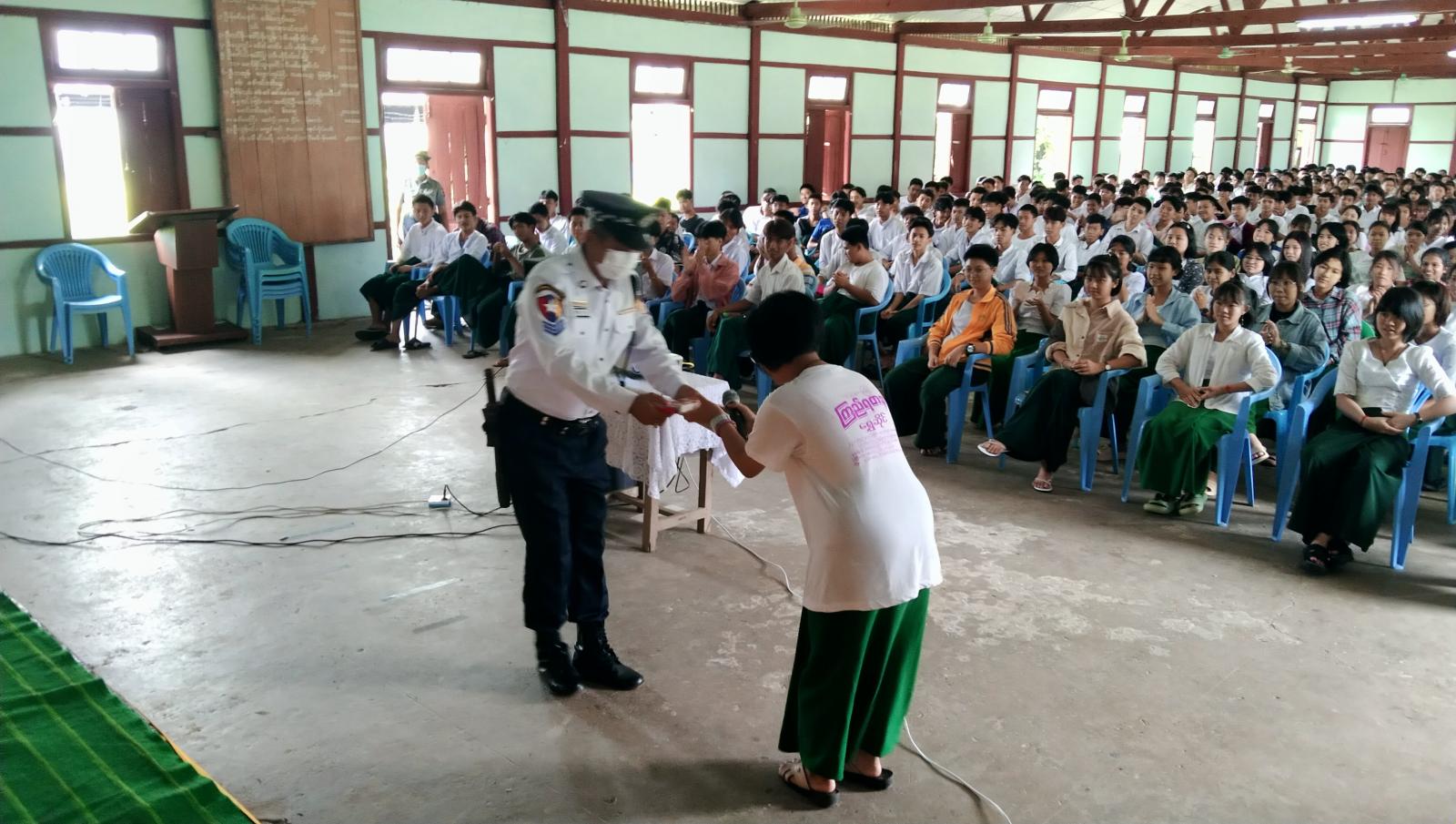 မိုးကောင်းမြို့နယ် ရဲတပ်ဖွဲ့မှူး ရဲမှူးရဲထွန်းအောင်ဦးစီး၍ အမှတ်(၁၀၁)ယာဉ်ထိန်းရဲ တပ်ဖွဲ့စိတ်မှ တပ်ကြပ်ကြီးစိုးမင်းနိုင်တို့နှင့်အတူ မြို့နယ်ပညာရေးမှူး ဒေါ်နွယ်နွယ်ကြီးကြပ်မှုဖြင့် အ.ထ.က(၂)ကျောင်းသား၊ ကျောင်းသူ(၂၀၀)ခန့်အား မှုခင်းပိုင်းနှင့်ယာဉ်စည်းကမ်းလမ်းစည်းကမ်းဆိုင်ရာများဟောပြောပြီး တက်ရောက်လာသည့် ကျောင်းသား၊ ကျောင်းသူများထဲမှ သိရှိလိုသည်များကို ပြန်လည်ရှင်းလင်းခဲ့ကြောင်း သိရသည်။