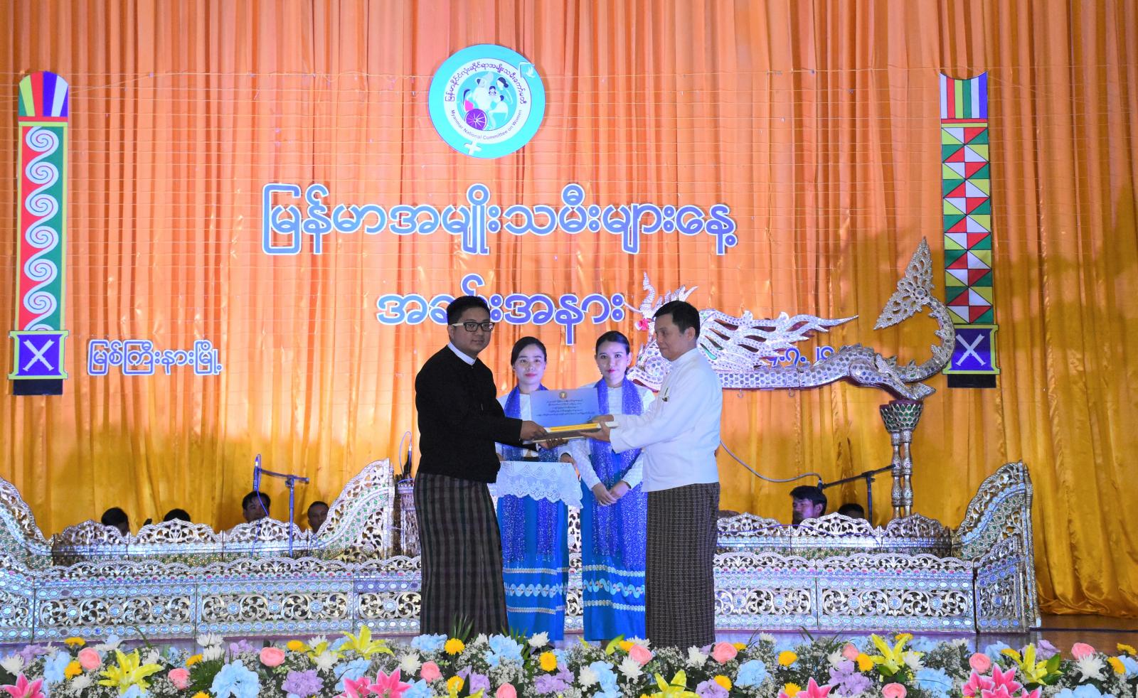 ဆက်လက်၍ ပြည်နယ်ဝန်ကြီးအစိုးရအဖွဲ့ဝင်ဝန်ကြီးများ၊ ပြည်နယ်ဝန်ကြီးချုပ်၏ ဇနီး၊ တိုင်းမှူး၏ဇနီး၊ ပြည်နယ်ဥပဒေချုပ်၊ ပြည်နယ်အမျိုးသမီးရေးရာအဖွဲ့ဥက္ကဋ္ဌနှင့် တာဝန်ရှိသူများက ပြည်နယ်အဆင့်ပညာရေး၊ ကျန်းမာရေး၊ လူမှုရေး၊ စီးပွားရေးနှင့်အားကစားကဏ္ဍတို့တွင် ထူးချွန် အမျိုးသမီးစွမ်းဆောင်ရှင်များအား ဂုဏ်ပြုမှတ်တမ်းလွှာများကို အသီးသီးပေးအပ်ချီးမြှင့်ခဲ့ကြပြီး တိုင်းရင်းသားရိုးရာအကအလှများဖြင့် ဖျော်ဖြေတင်ဆက်ခဲ့ကြရာ ပြည်နယ်ဝန်ကြီးချုပ်က ဖျော်ဖြေတင်ဆက်ခဲ့ကြသည့် တိုင်းရင်းသူအကအဖွဲ့များအတွက် ထောက်ပံ့ချီးမြှင့်ငွေကျပ်သိန်း ၂၀ ကို ထောက်ပံ့ပေးအပ်ခဲ့ကြောင်း သိရှိရသည်။