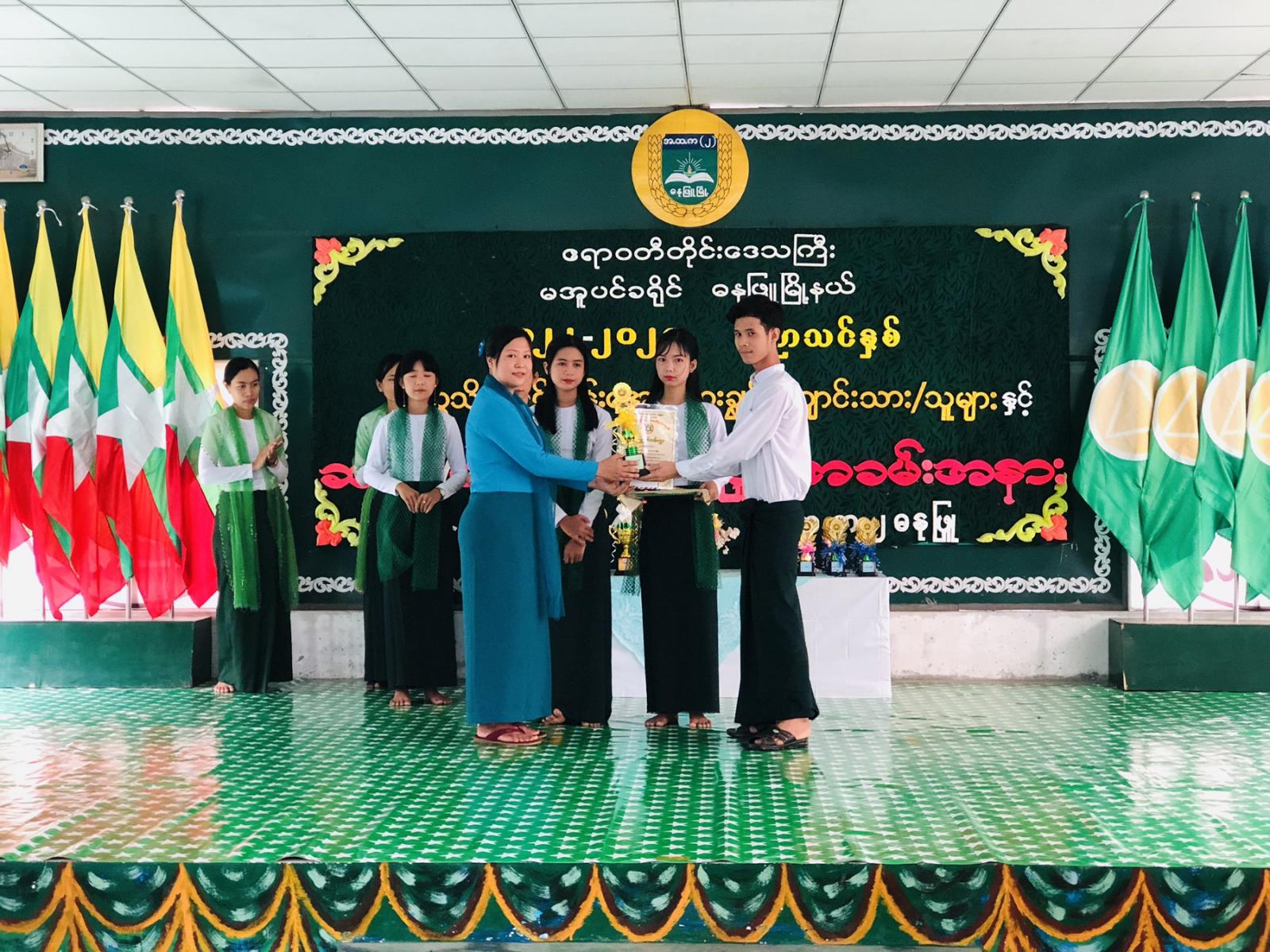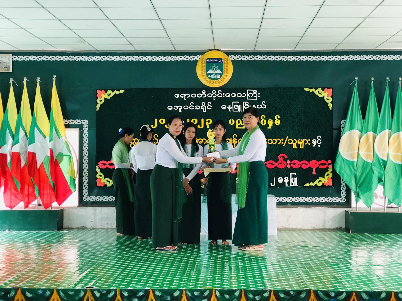 ဧရာဝတီတိုင်းဒေသကြီး၊ မအူပင်ခရိုင်၊ ဓနုဖြူမြို့နယ် အမှတ်(၂) အခြေခံပညာအထက်တန်း ကျောင်း၏ ၂၀၂၂-၂၀၂၃ ပညာသင်နှစ် တက္ကသိုလ်ဝင်တန်းအောင် ထူးချွန်ကျောင်းသား/သူများနှင့် ဆရာ/ဆရာမများအား ဂုဏ်ပြုပွဲအခမ်းအနားကို ယမန်နေ့ နံနက် ၉ နာရီအချိန်က ပညာ့ဗိမာန်ခန်းမ၌ ကျင်းပသည်။