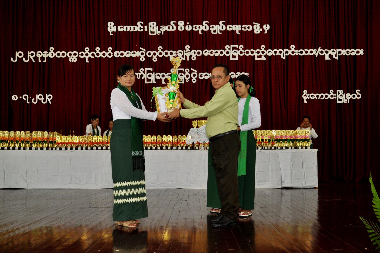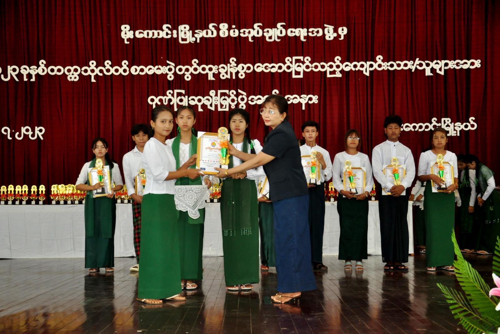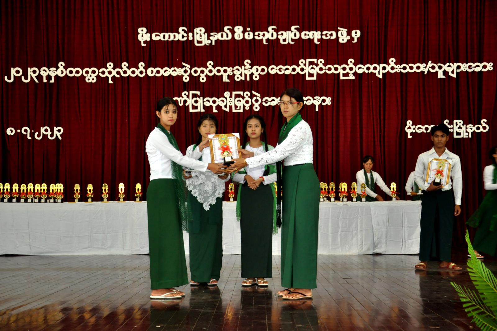 အဆိုပါဂုဏ်ပြုဆုချီးမြှင့်ပွဲတွင် မူလွန်အရှေ့ရပ် ကျောင်းသား၊ ကျောင်းသူများက “စည်းလုံးခြင်း အတွက်သီချင်းတစ်ပုဒ်” တေးသီချင်းဖြင့်လည်းကောင်း၊ အ.ထ.က-မန်ရွက်ကျောင်းမှ “မမေ့နိုင်တဲ့ ကချင်မြေ”၊ “ပျံသန်းကြစို့” တေးသီချင်းများဖြင့်လည်းကောင်း၊ အ.မ.က-အလယ်ရပ်ကျောင်းမှ “ကြာဆစ်ကြိုး” တေးသီချင်းဖြင့်လည်းကောင်း၊ မူလွန်-အရှေ့ရပ်ကျောင်းမှ “ထာဝရသစ္စာ” တေးသီချင်းဖြင့် လည်းကောင်း၊ အ.ထ.က-နောင်ကိုင်တော်ကျောင်းမှ ကျောင်းသား ကျောင်းသူများက “မြန်မာ့ကျောင်း” တေးသီချင်းဖြင့် လည်းကောင်း အသီးသီး သီဆိုကပြဖျော်ဖြေခဲ့ကြောင်း သိရသည်။