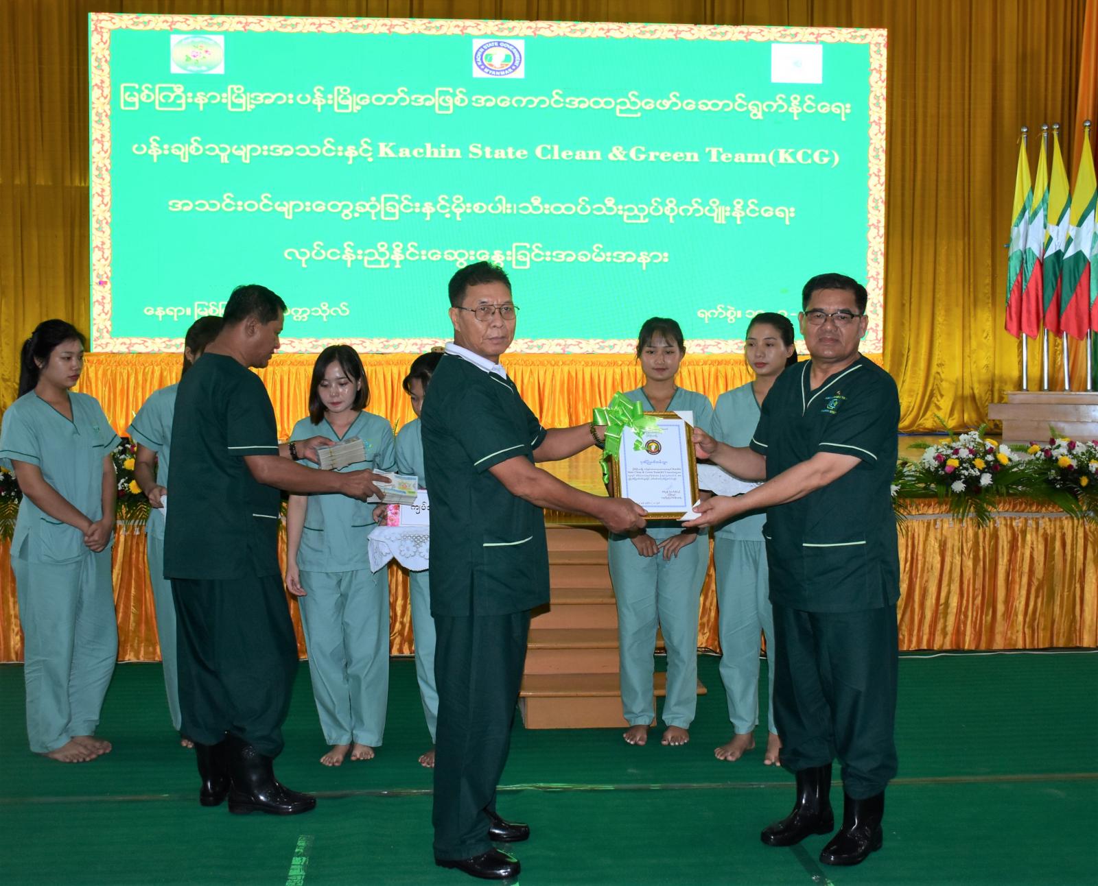 ထို့နောက် ပြည်နယ်ဝန်ကြီးချုပ်က မြစ်ကြီးနားမြို့သန့်ရှင်းသာယာလှပပြီး စိမ်းလန်းစိုပြေရေးလုပ်ငန်းများ ပူးပေါင်းဆောင်ရွက်ကြမည့် ပန်းချစ်သူများအသင်းနှင့် Kachin State Clean & Green Team (KCG) အသင်းများအတွက် အလှူရှင်များက ထောက်ပံ့ငွေကျပ်သိန်း (၅၀၀)ကိုလှူဒါန်းကြရာ လှူဒါန်းငွေမှုကို လက်ခံရယူပြီး ဂုဏ်ပြုမှတ်တမ်းလွှာများကို ပြန်လည်ပေးအပ်ခဲ့သည်။