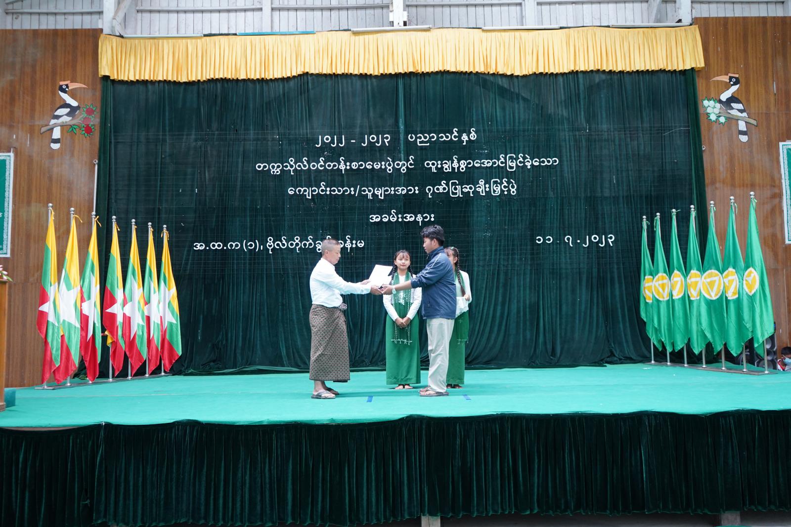 ထို့နောက် တက္ကသိုလ်ဝင်တန်းစာမေးပွဲတွင် ထူးချွန်စွာ အောင်မြင်ခဲ့သော ကျောင်းသား/ ကျောင်းသူများ ဂုဏ်ပြုဆုချီးမြှင့်ခြင်း အခမ်းအနား ဆက်လက်ကျင်းပရာ ဂုဏ်ထူးရ ကျောင်းသား/ကျောင်းသူများအား ဟားခါးတက္ကသိုလ်မှ ဒုတိယပါမောက္ခချုပ် ဒေါက်တာနွယ်သင်းနီ၊ အမှတ်(၁) အခြေခံပညာအထက်တန်းကျောင်းအုပ်ဆရာမကြီး ဒေါ်အေးသိန်း၊ အလှူရှင် ဦးသန်းအောင်ကလည်းကောင်း၊ တက္ကသိုလ်ဝင်တန်းစာမေးပွဲတွင် အောင်မြင်ခဲ့သော ကျောင်းသား/ ကျောင်းသူများအား အမှတ်(၂) အခြေခံပညာအထက်တန်းကျောင်း၊ ကျောင်းအုပ်ဆရာမကြီး ဒေါ်ဖွာဒေါ့နှင့် ဆရာကြီးဟိုင်ဆန်တို့လည်းကောင်း ဆုများ အသီးသီးပေးအပ်ချီးမြှင့်ကြသည်။