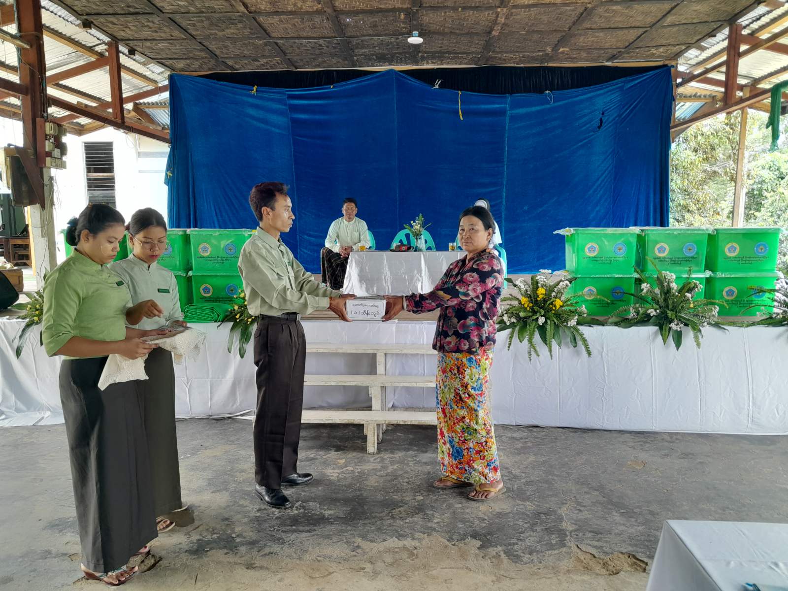 အဆိုပါ ထောက်ပံ့ငွေနှင့်ကယ်ဆယ်ရေးပစ္စည်းများကို လူမှုဝန်ထမ်း၊ ကယ်ဆယ်ရေးနှင့်ပြန်လည်နေရာချထားရေးဝန်ကြီးဌာန၊ ဘေးအန္တရာယ်ဆိုင်ရာစီမံခန့်ခွဲမှုဦးစီးဌာနမှ (RC)စစ်ရှောင်စခန်းမှ အတည်တကျပြောင်းရွှေ့နေထိုင်သည့် အိမ်ထောင်စု(၁၂)စု၊ လူဦးရေး(၅၁)ဦးတို့အတွက် အိမ်ထောင်စု(၁)စုလျှင် ငွေကျပ်(၁)သိန်းနှုန်းဖြင့်လည်းကောင်း၊ ဆန်ရိက္ခာဖိုးငွေ တစ်လစာ တစ်ဦးလျှင်(၉၀၀၀)ကျပ်နှုန်းဖြင့်လည်းကောင်း၊ ပြောင်းရွှေ့အိမ်ထောင်စု (၁၂)စုအတွက်ကယ်ဆယ်ရေးပစ္စည်း(၁၆)မျိုးပါ ပုံး(၁၂)ပုံးတို့ကိုလည်းကောင်း မြို့အုပ်ချုပ်ရေးမှူး၏ဦးဆောင်မှုဖြင့် သင်ဆိုင်ရာတာဝန်ရှိသူများနှင့် ဘာသာရေးအဖွဲ့ခေါင်းဆောင်များက သွားရောက်ထောက်ပံ့ပေးအပ်ခဲ့ကြောင်း သိရသည်။